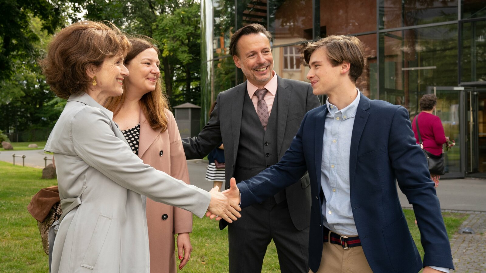 Emmas GeheimnisMusikschulleiterin Mira Conradi (Victoria Trauttmansdorff, l.) freut sich mit ihrem Schüler Lukas (Paul Sundheim, r.) und seinen Eltern Frau Engelhardt (Jenny Maruhn, 2.v.l.) und Herrn Engelhardt (Ingo Abel, 2.v.r.), dass Lukas fehlerfrei vorgespielt hat.Bild: © ZDF und Georges Pauly./Georges Pauly