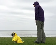 Mit Mops ans Meer (2)Schlechtes Wetter: Frida im Friesennerz mit Michael Kessler auf Pellworm.Bild: © NDR/rbb/Thorsten Klauschke