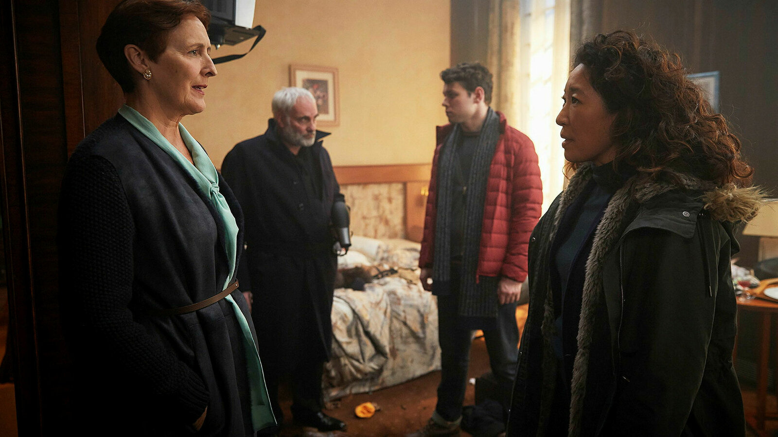 Gott, bin ich müdeBegegnung im Hotelzimmer: Fiona Shaw als Carolyn Martens, Kim Bodnia als Konstantin, Sean Delaney als Kenny Stowton, Sandra Oh als Eve PolastriBild: © CH4