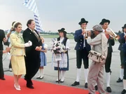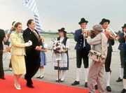 Königliche HoheitStandesgemäß wird die Königin von Mandalia (Michaela May, l) vom Ministerpräsidenten (Georg Marischka) auf dem Flughafen in Empfang genommen. Herbie (Dieter Hildebrandt, r) ist dabei voll in Aktion.Bild: © WDR