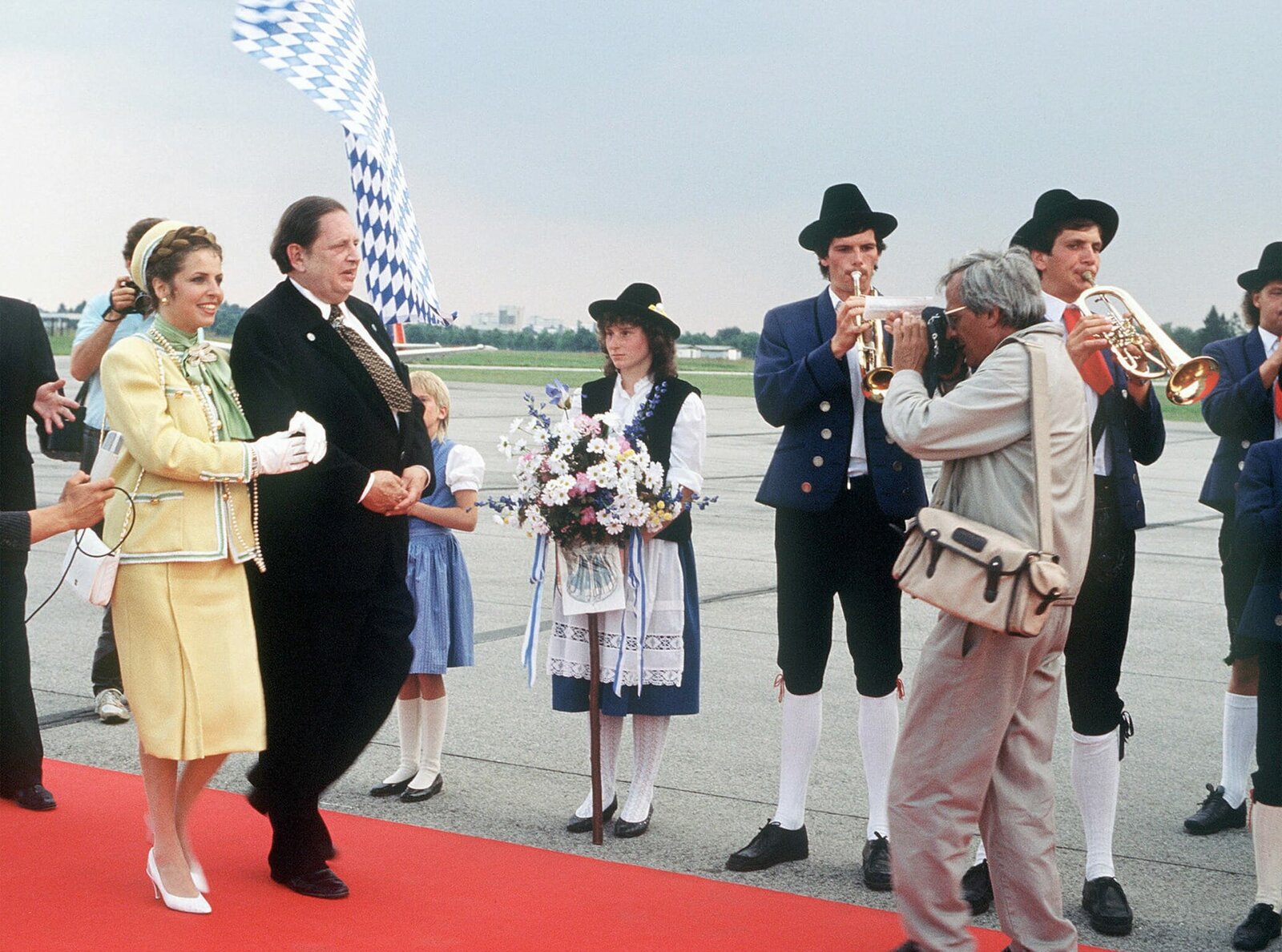 Königliche HoheitStandesgemäss wird die Königin von Mandalia (Michaela May) vom Ministerpräsidenten (Georg Marischka, links) auf dem Flughafen in Empfang genommen. Für Fotograf Herbie (Dieter Hildebrandt) ist das ideal.Bild: © WDR/WDR