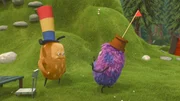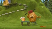 KrankKiwi merkt, dass Strit seinen Hut gegen eine Bratpfanne vertauscht hat.Bild: © NDR/Copenhagen Bombay