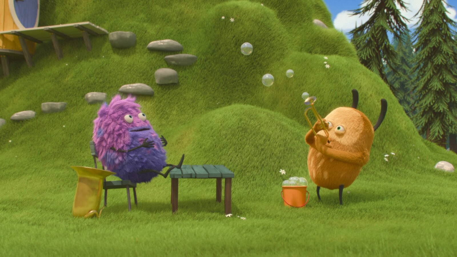 Das GeräuschStrit starrt auf die Blasen, die aus der Trompete kommen, auf der Kiwi spielt.Bild: © NDR/Copenhagen Bombay Rights