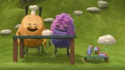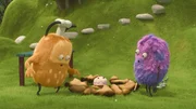 Das Kuchen-ChaosKiwi und Strit starren auf den Wunderkuchen, der im verbrannten Kuchen steckte.Bild: © NDR/Copenhagen Bombay Rights