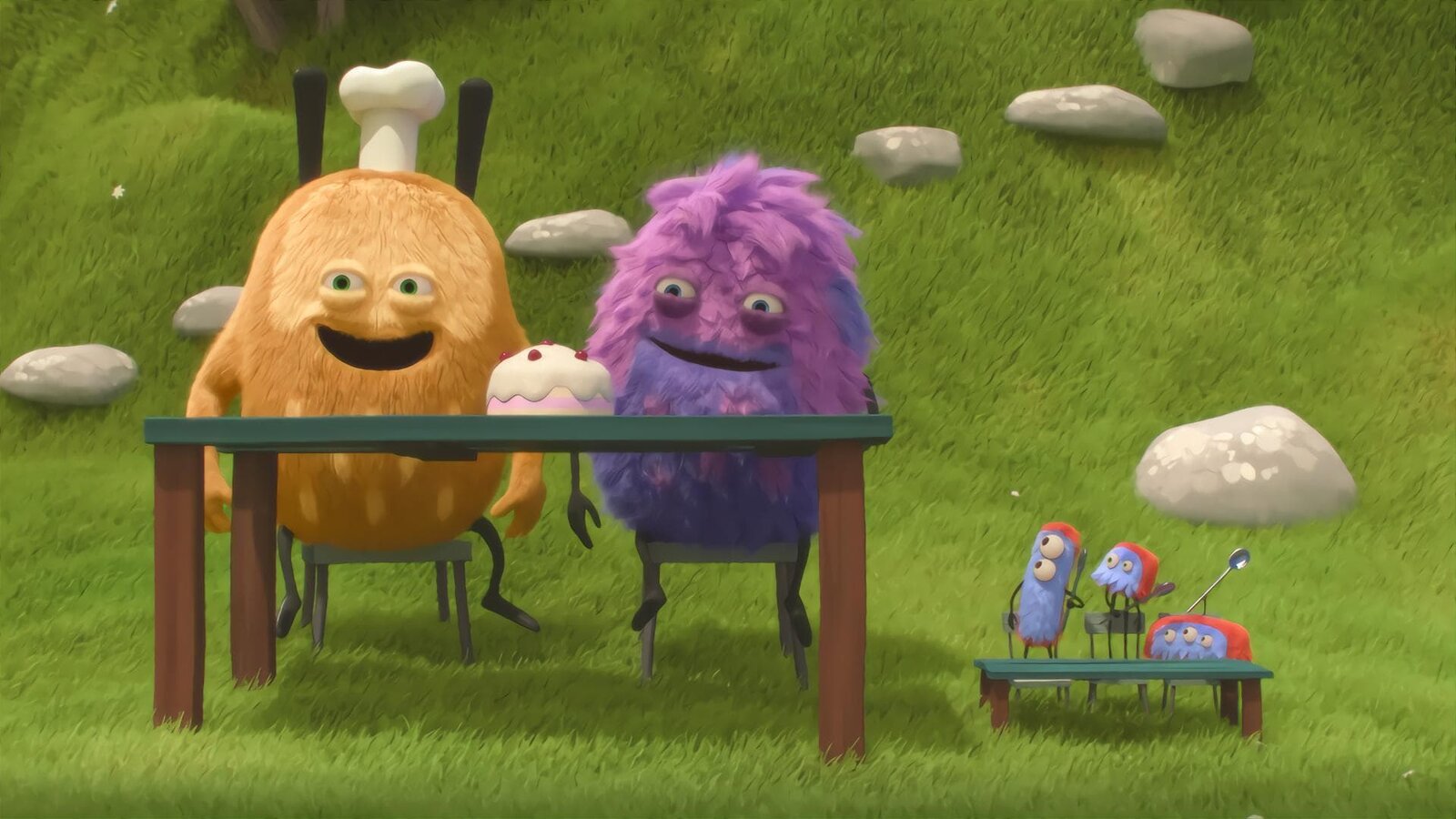 Das Kuchen-ChaosKiwi und Strit sehen glücklich aus, kurz bevor der Kuchen zerstört wird.Bild: © NDR/Copenhagen Bombay Rights