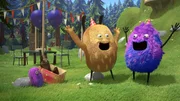 Die KlebeStrit hat Kiwis Klebeflasche geklaut und alles Mögliche zusammen geklebt. Kiwi ist nicht begeistert.Bild: © NDR/Copenhagen Bombay