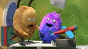 Die KlebeKiwi stellt fest, dass Strit alles zusammen geklebt hat, was ihm unter die Finger gekommen ist ? wirklich alles!Bild: © NDR/Copenhagen Bombay