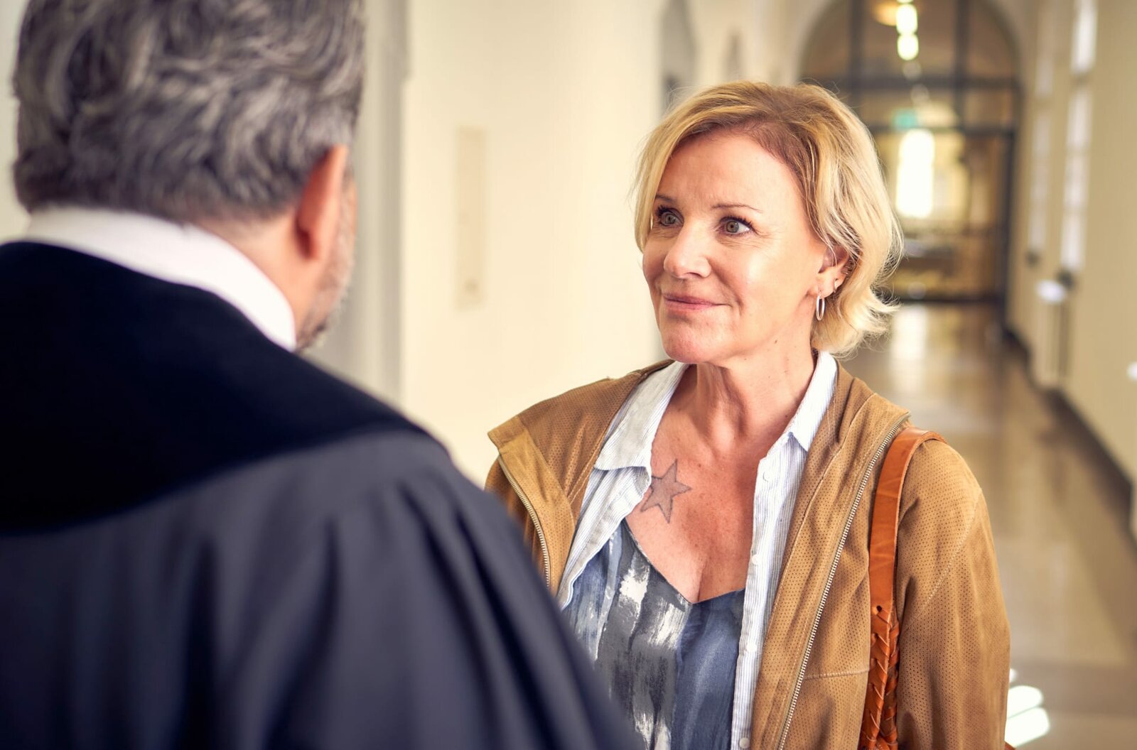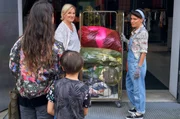Liebe macht blindKlara (Mariele Millowitsch, links) versucht Eda Balci (Soma Pysall, Mitte) klarzumachen, dass sie mit dem Drogenschmuggel alles aufs Spiel setzt. Robert (Sammy Schrein) kommt dazu.Bild: © ARD Degeto/Frank Dicks
