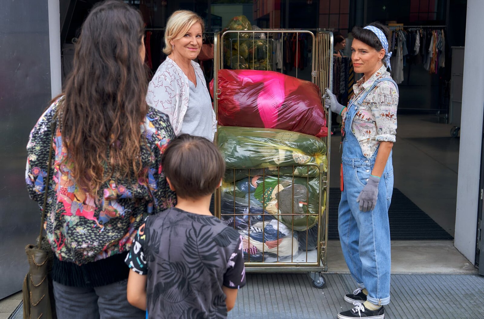 Liebe macht blindKlara (Mariele Millowitsch) hat vermittelt: Eda (Soma Pysall, vorne li.) bringt ihren Sohn Robert (Sammy Schrein, vorne re.) mit zur Arbeit bei Danni (Jutta Dolle, re.).Bild: © ARD Degeto/Frank Dicks