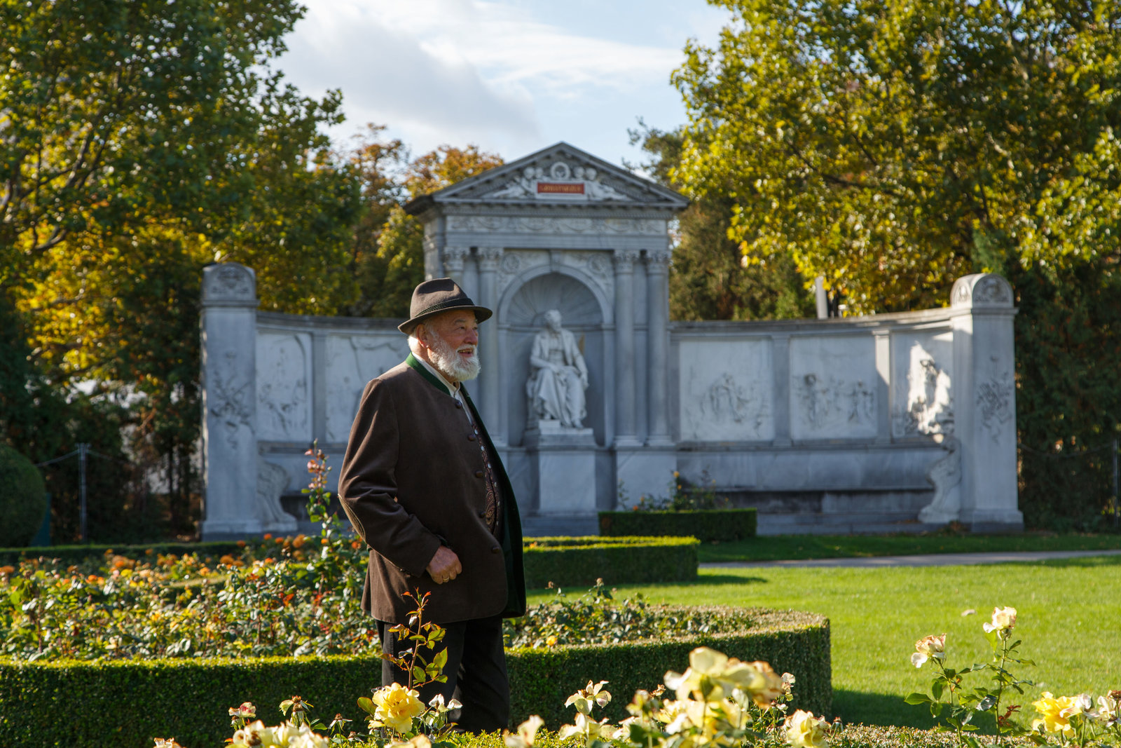 Kulturjubel - 650 Jahre Österreichische Nationalbibliothek in WienSepp Forcher im Wiener Volksgarten vor dem Grillparzer-Denkmal.Bild: © ORF2