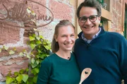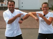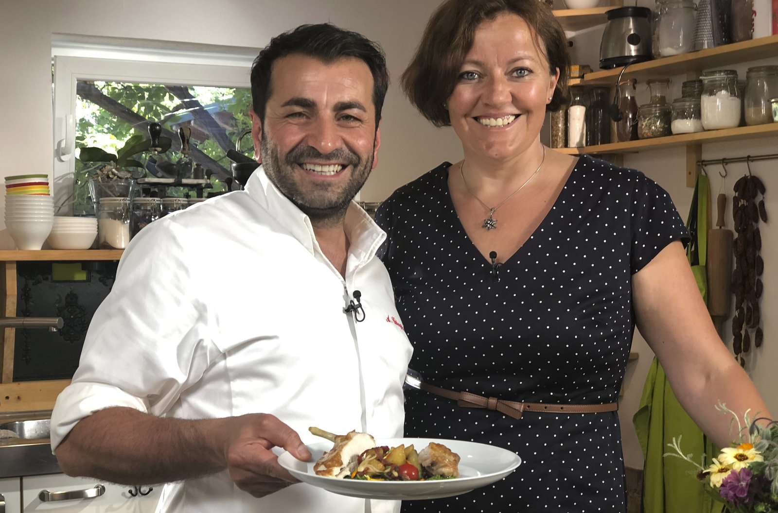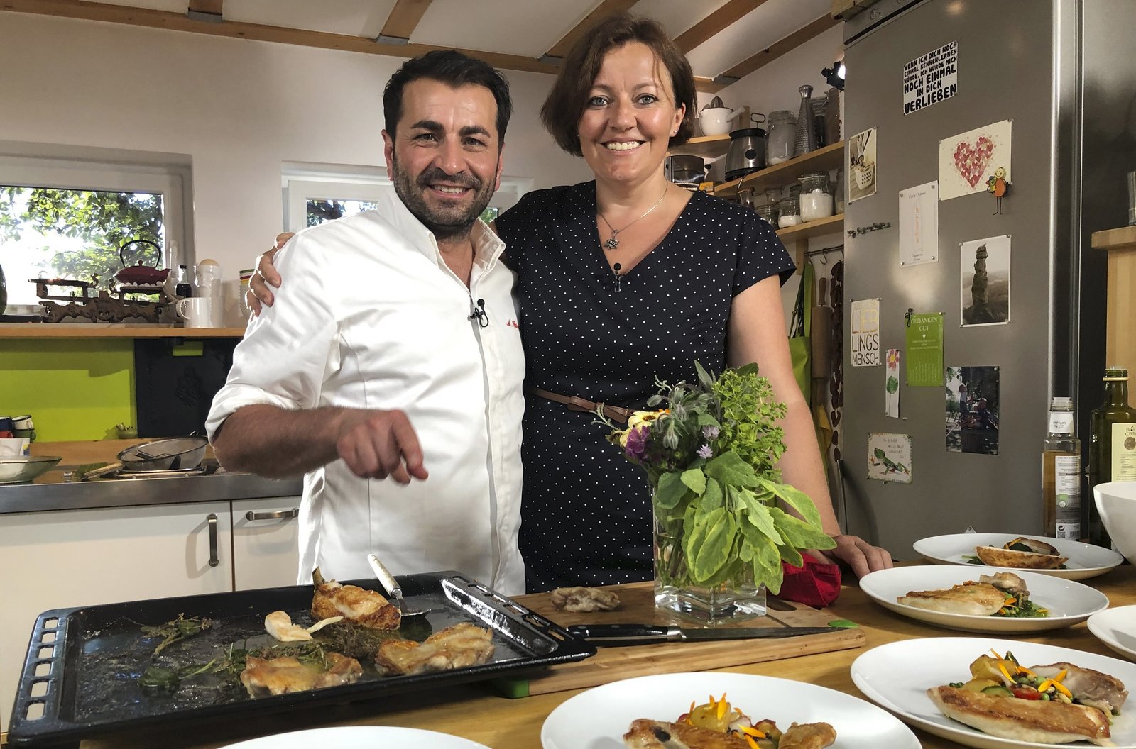 Huhn mit Bratkartoffel-Linsen-Salat von Ali GüngörmüsAli Güngörmüs und Regine Traud in Hünfeld-Molzbach mit Alis Interpretation von Regines Hühnchen.Bild: © HR/Bettina Schrauf