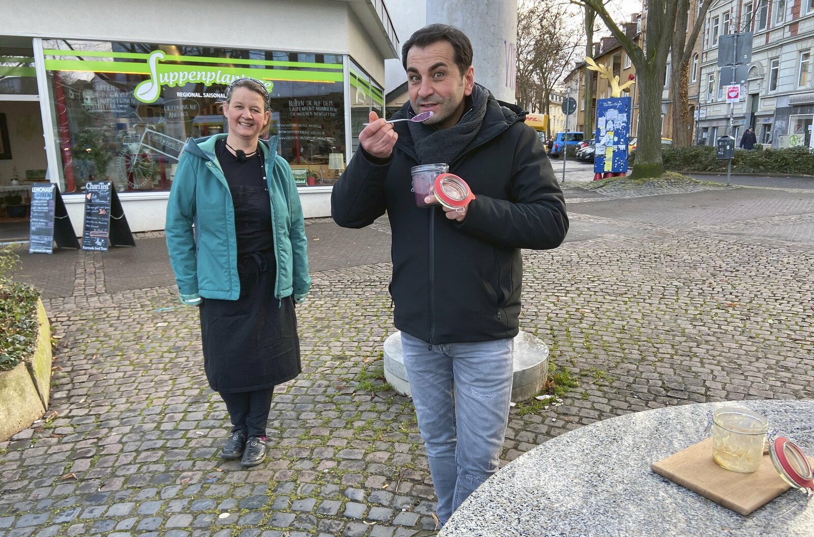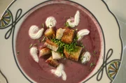Ali, der Fleischgourmet und die geschmorte LammschulterCharly Ende Vorspeise: Rotkohlsüppchen mit Croutons.Bild: © HR