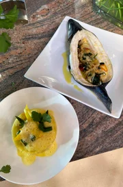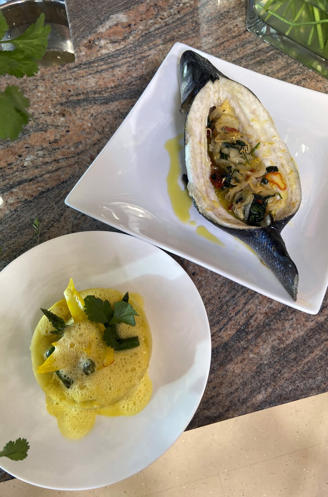 Gefüllter Wolfsbarsch mit Kartoffelstampf, Safran-Fenchel und grünem Spargel von Ali GüngörmüsAlis Hauptgang: gefüllter Wolfsbarsch mit Kartoffelstampf und grünem Spargel.Bild: © HR
