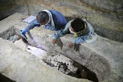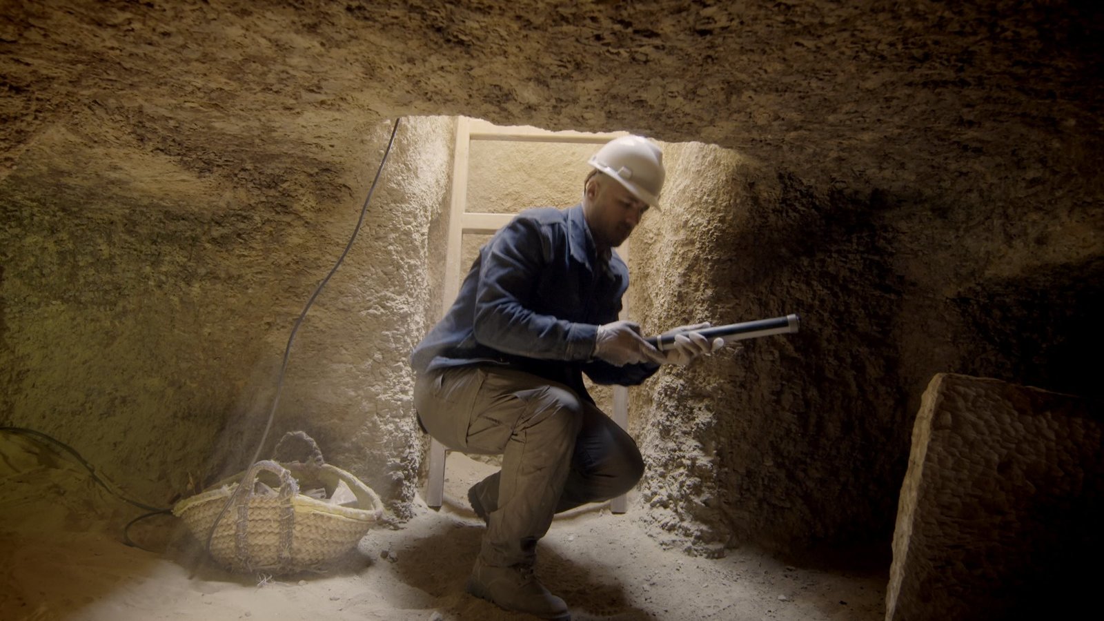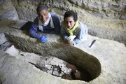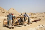 Verborgene KammerSaqqara, Egypt - The mummy workshop and communal burial shaft lie in the shadow of two of Saqqara's most famous pyramids - the Step Pyramid and the Unas Pyramid. Workers approach the winch used to carry priceless artifacts out of the tomb shaft. (National Geographic/Rafael Libson-Hochenberg)Bild: © Rafael Libson-Hochenberg / National Geographic/Rafael Libson-Hochenberg / National Geographic