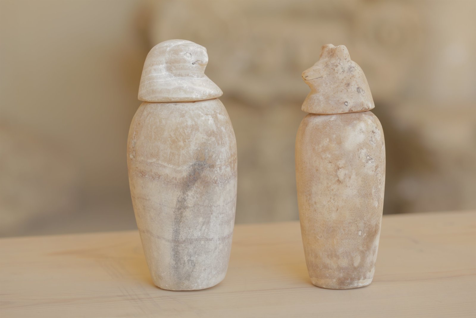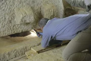 Verborgene KammerSaqqara, Egypt - The mummy of a woman called Didi Bastet was found with an unprecedented six canopic jars. The two extra jars are distinctive - one bears a falcon head, the other the head of a jackal - both are carved from stunning calcite and show little sign of their age. (National Geographic/Piers Leigh)Bild: © Copyright © The National Geographic Channel.