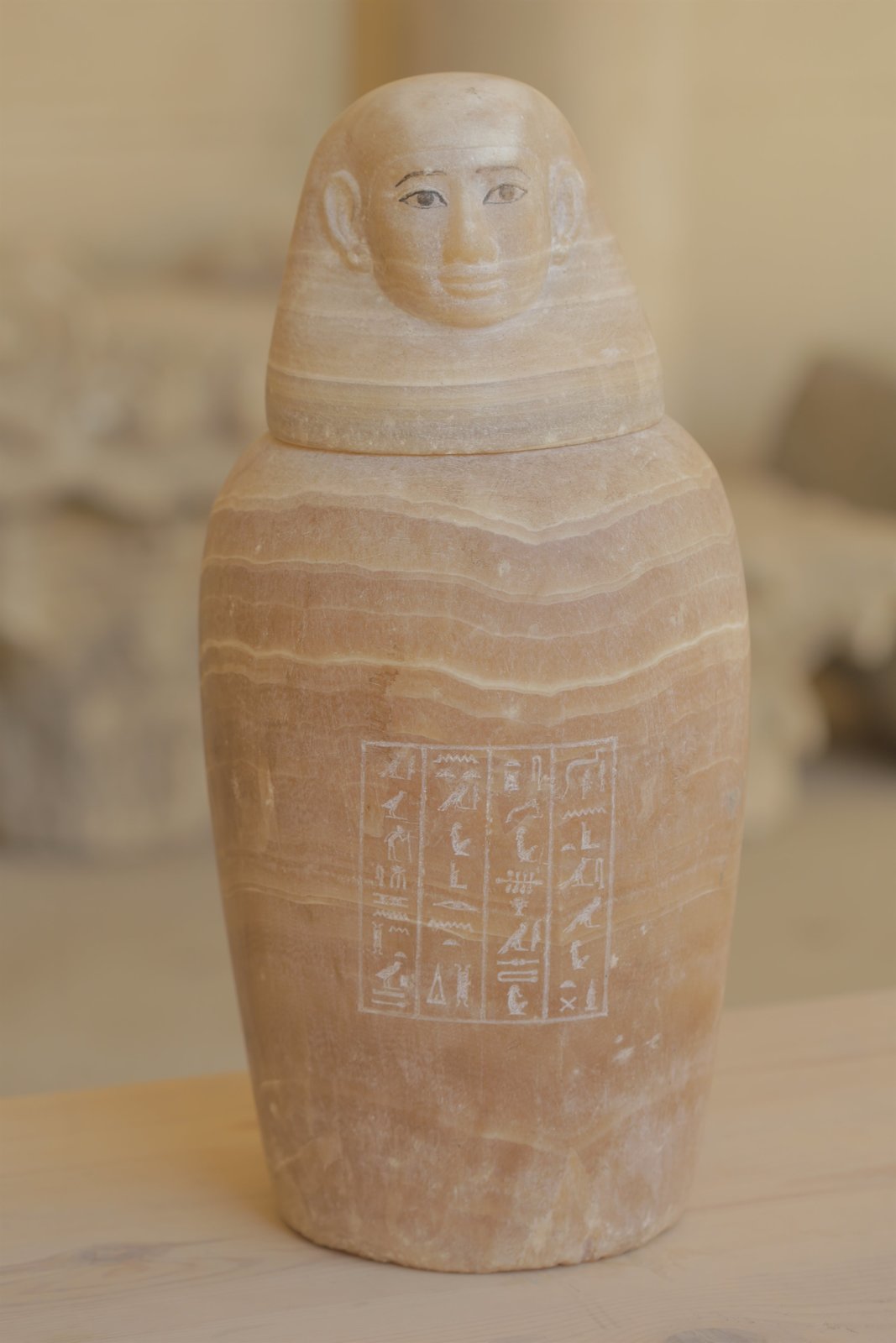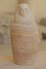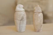 Das gebrochene SiegelOne of Ayawet's finely carved canopic jars, topped with a lid in the image of the human-headed god Imsety. Canopic jars were made to contain the key organs removed from the body during the mummification process. It was Imsety's role to protect the liver. (National Geographic/Piers Leigh)Bild: © Copyright © The National Geographic Channel.