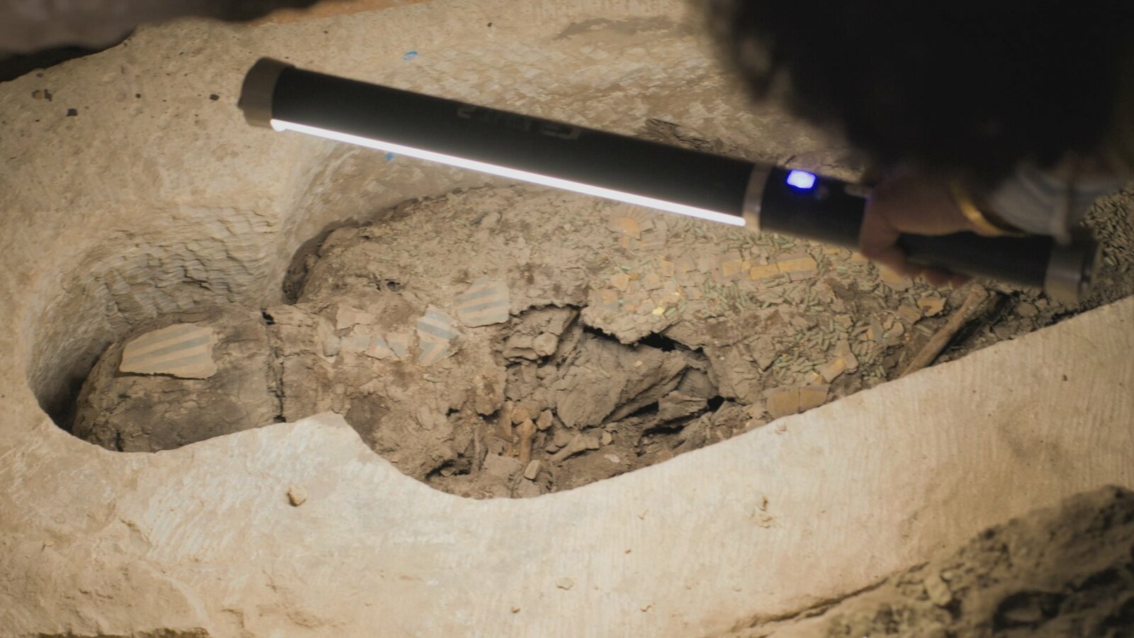 Verborgene KammerProfessor Salima Ikram uses a light wand to illuminate a mummy in a 2,600 year old burial complex. Painted cartonnage and dozens of beads can be seen, indicating this was a high class burial.Bild: © Copyright © The National Geographic Channel.