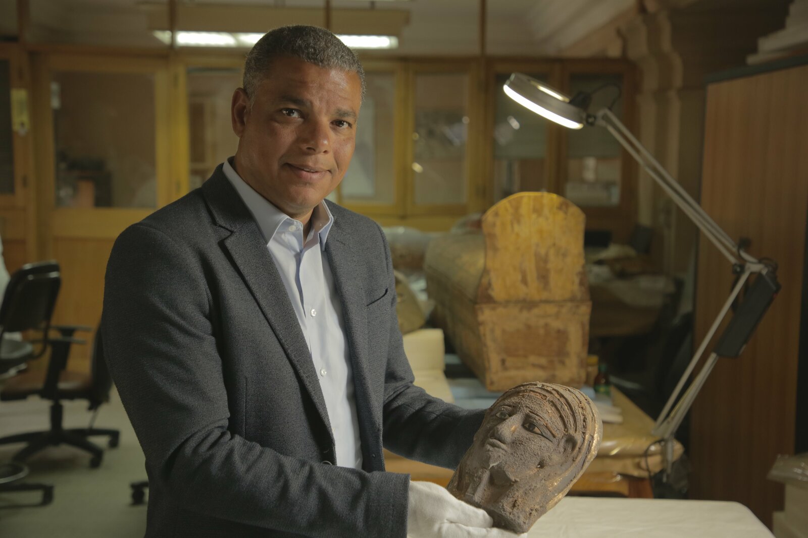 Das gebrochene SiegelIn the conservation laboratories of the Egyptian museum, Ramadan Hussein is reunited with the gilded silver mummy mask he discovered in the tombs of Saqqara. It's the first found in Egypt since 1939. In Ancient Egypt silver was double the value of gold and thought to represent the bones of the gods.Bild: © Copyright © The National Geographic Channel.