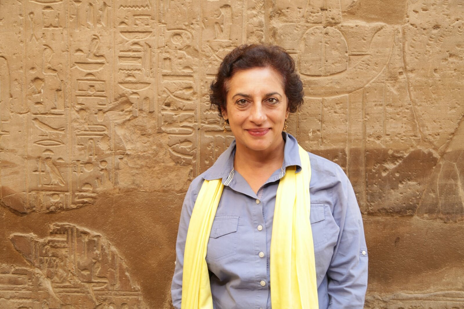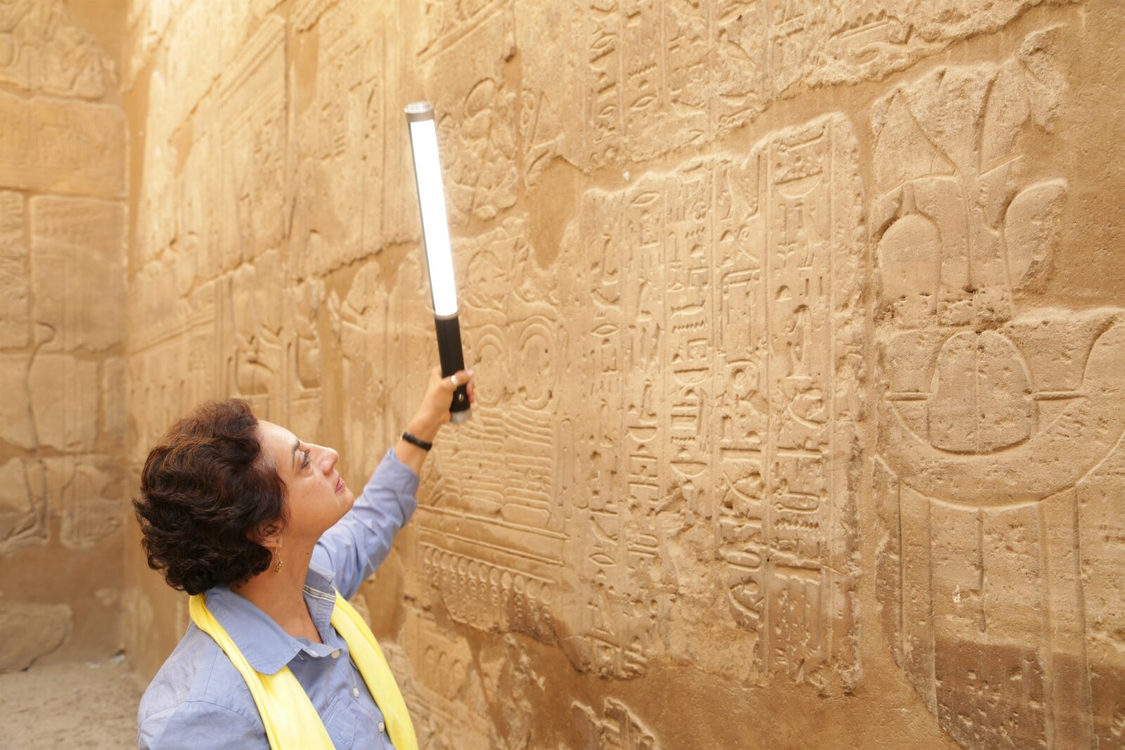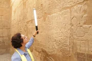 Die Diener der SchlangengöttinProf Salima Ikram uses a light wand to illuminate hieroglyphs on the walls of Luxor Temple. Although the visit takes place in daylight, the wand helps to manipulate light and shadow around the engraved symbols, and allows for easier reading of the 3D text. (National Geographic/Bianca Zamfira)Bild: © Piers Leigh / National Geographic/Piers Leigh / National Geographic