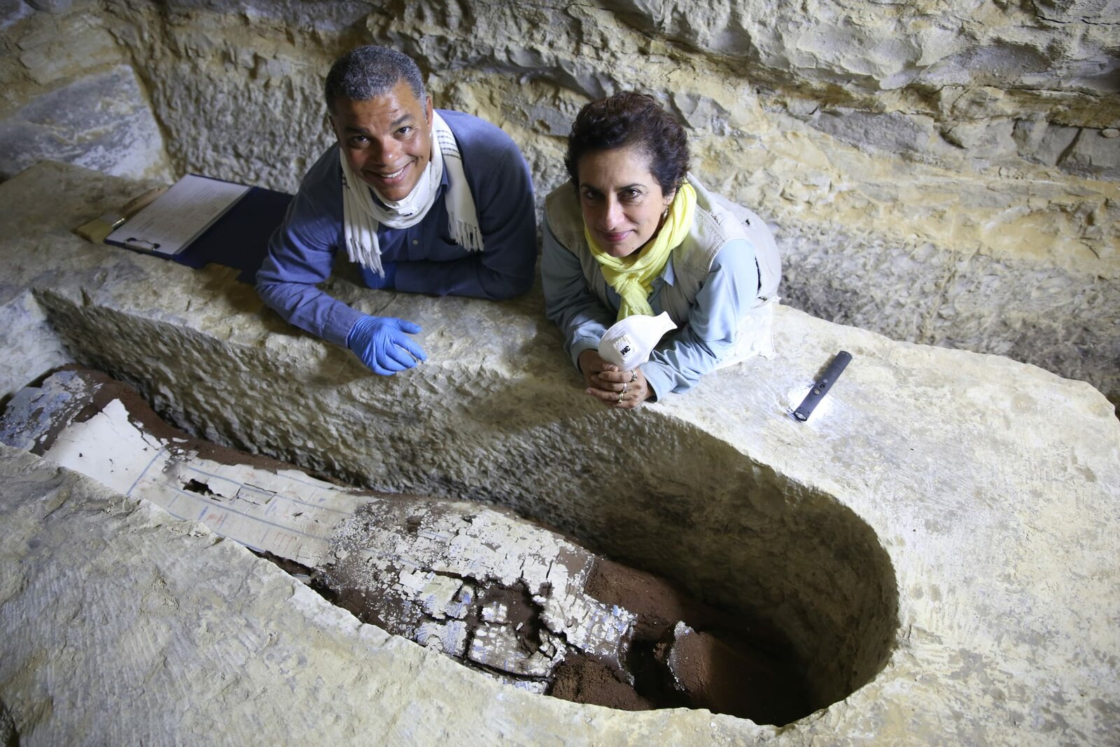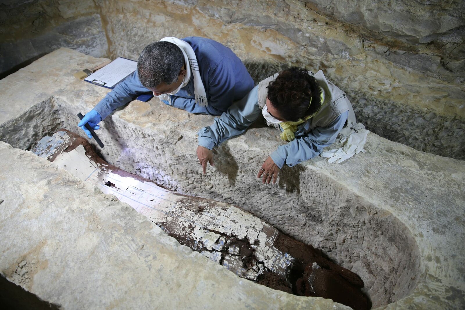 Der einsame SargProfessor Salima Ikram and Dr. Ramadan Hussein examine the coffin of Tadihor, still nestled in the niche cut into her vast stone sarcophagus.Bild: © Lina Zilinskaite / National Geographic/Lina Zilinskaite / National Geographic