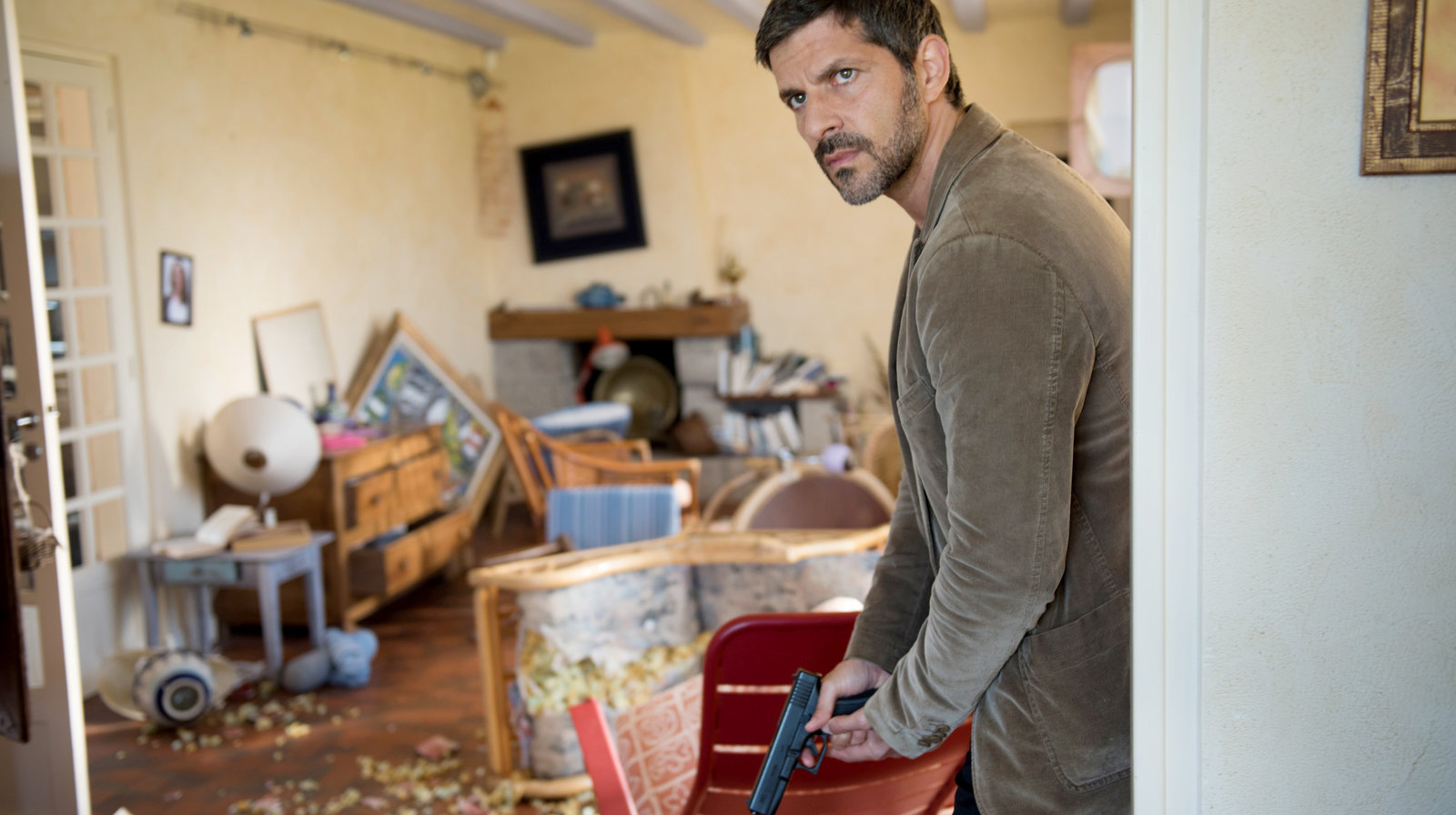 Bretonische FlutDa hat wohl jemand was gesucht! Kommissar Dupin (Pasquale Aleardi) ist vorsichtig und zückt seine DienstwaffeBild: © ARD Degeto/Wolfgang Ennenbach