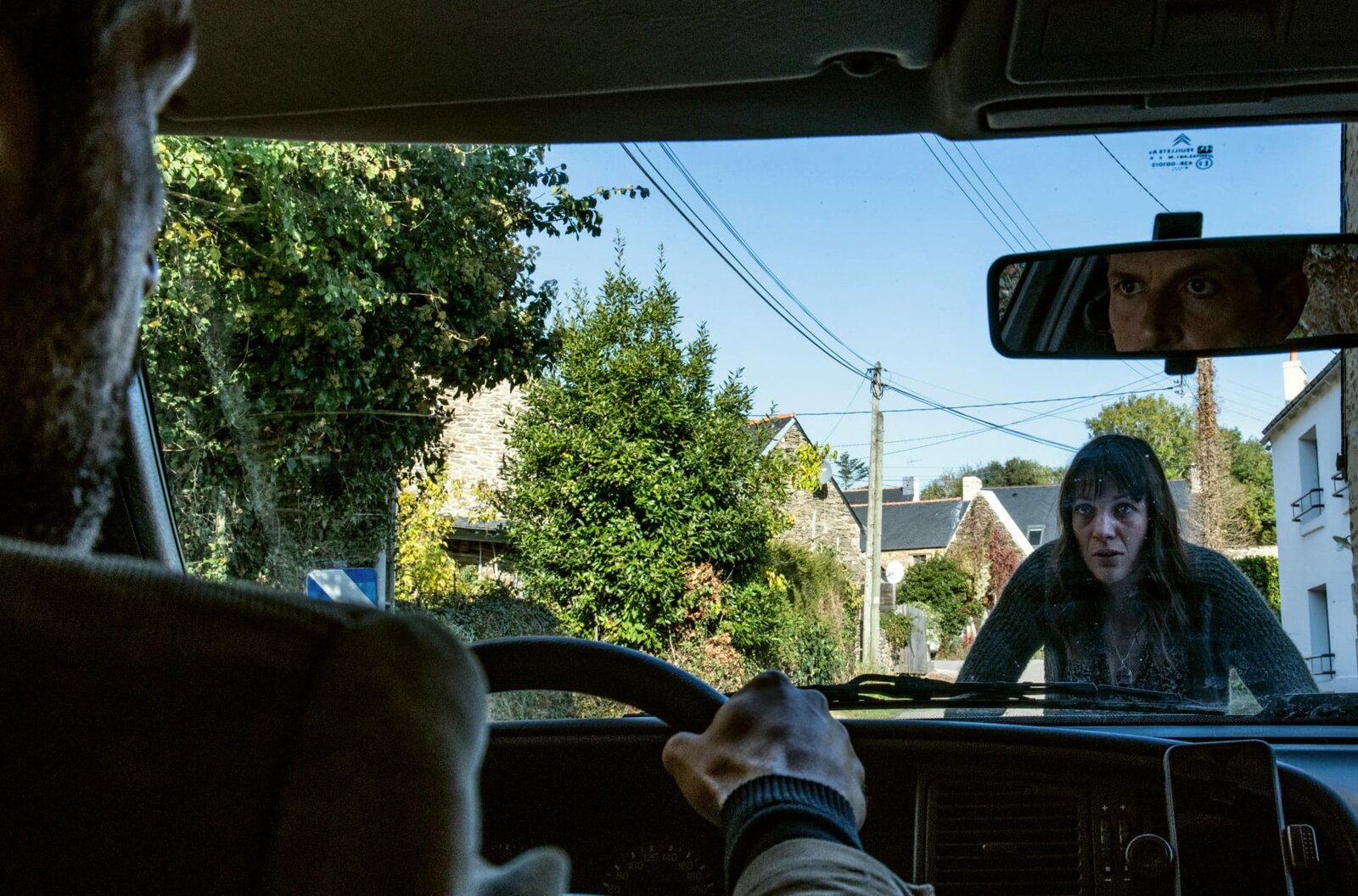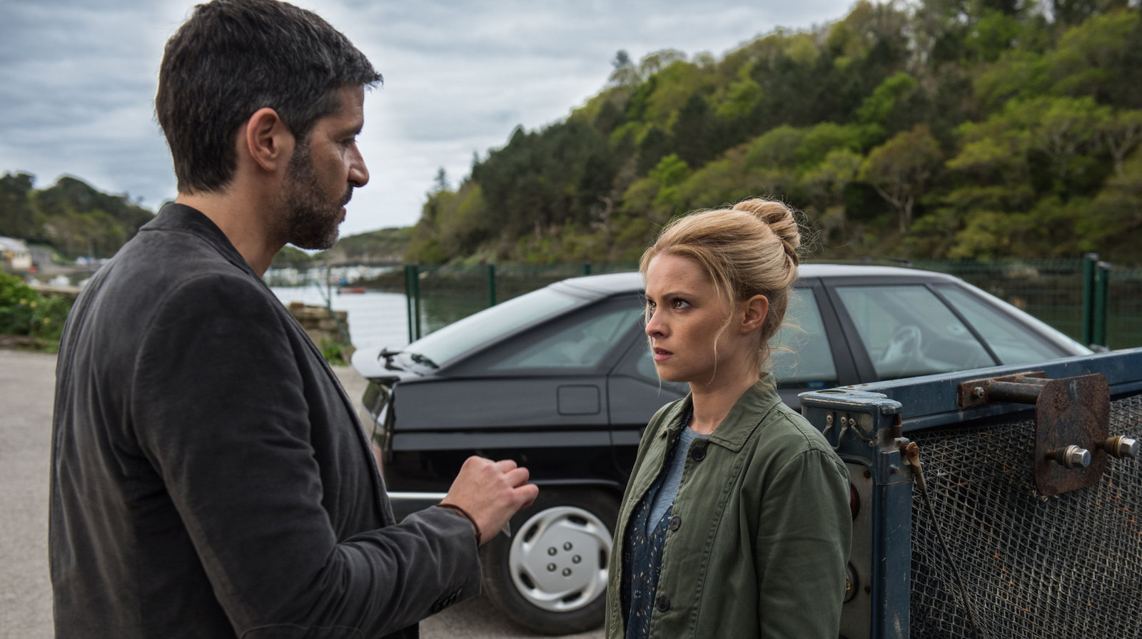 Bretonische GeheimnisseBlanche Cadiou (Oona von Maydell) läuft Kommissar Dupin (Pasquale Aleardi) vors Auto.Bild: © ARD Degeto/Wolfgang Ennenbach