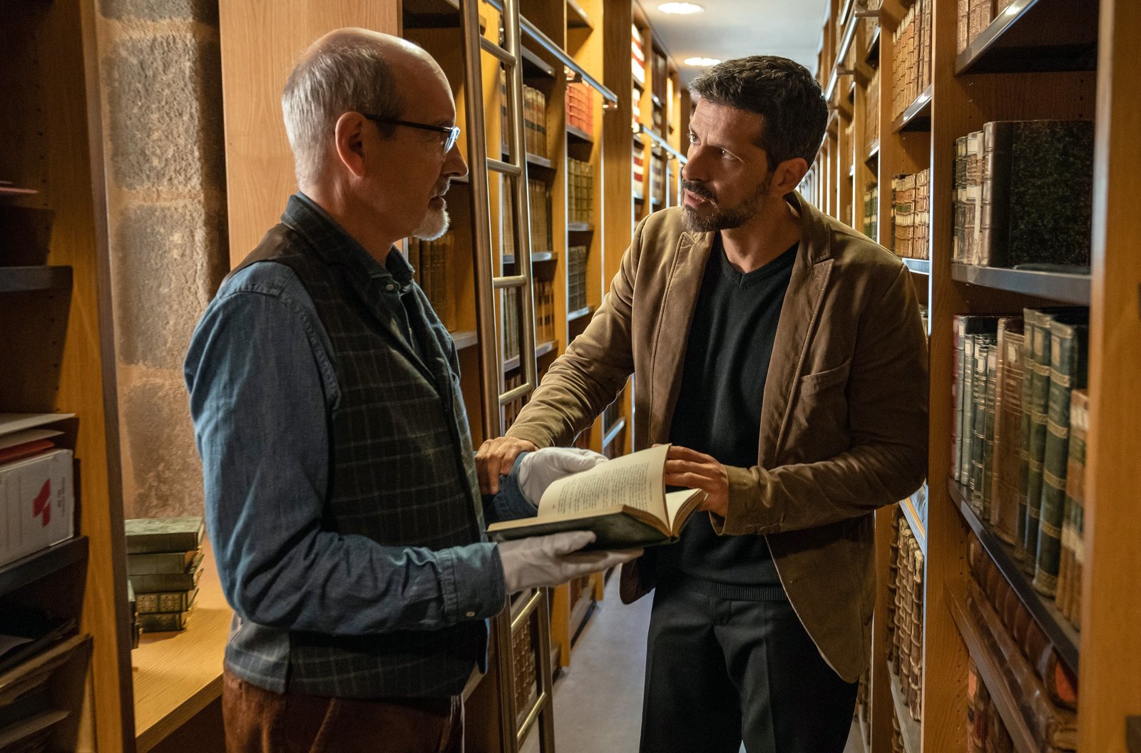 Bretonische GeheimnisseDupin (Pasquale Aleardi) folgt einer Spur, die zu dem Historiker Yannick Draoulec (René Schoenenberger, li.) führt.Bild: © ARD Degeto/Wolfgang Ennenbach