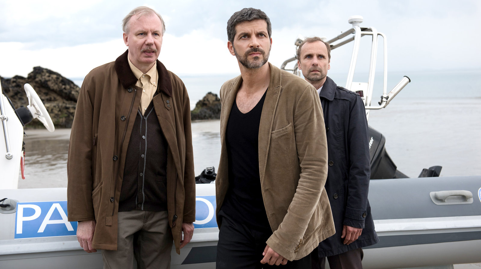 Bretonische FlutÜberraschung am Boot der beiden Mordopfer? Kommissar Dupin (Pasquale Aleardi, Mitte), Inspektor Kadeg (Jan Georg Schütte, re.) und Bürgermeister Antoine Manet (Ludger Pistor, li.) ausBild: © ARD Degeto/Wolfgang Ennenbach