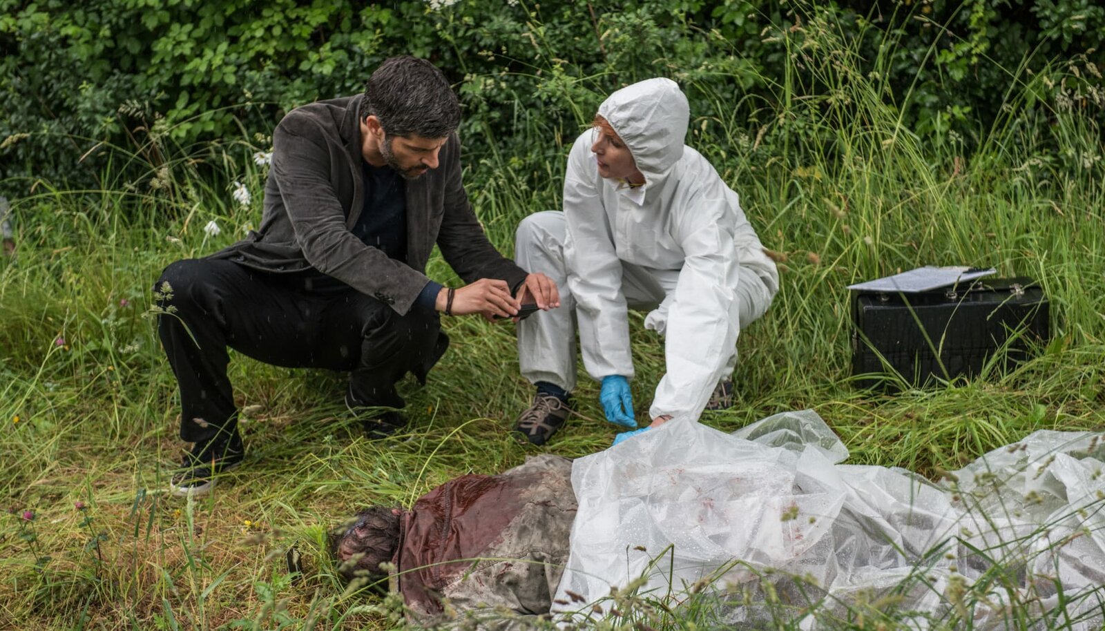 Bretonische FlutKommissar Dupin (Pasquale Aleardi, li.) und sein Kollege Inspektor Riwal (Ludwig Blochberger) untersuchen den Tatort der Leiche (Sophie Chasselat) etwas genauer.Bild: © ARD Degeto/Wolfgang Ennenbach