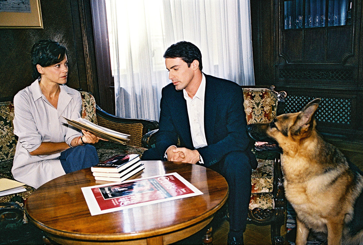 BesessenKommissar Brandtner (Gedeon Burkhard, r.) und Rex versuchen, von Tina Hechts Verlegerin Lisa Aigner (Angela Roy, l.) den geheimen Aufenthaltsort der Autorin zu erfahren.Bild: © Sat.1 Eigenproduktionsbild frei