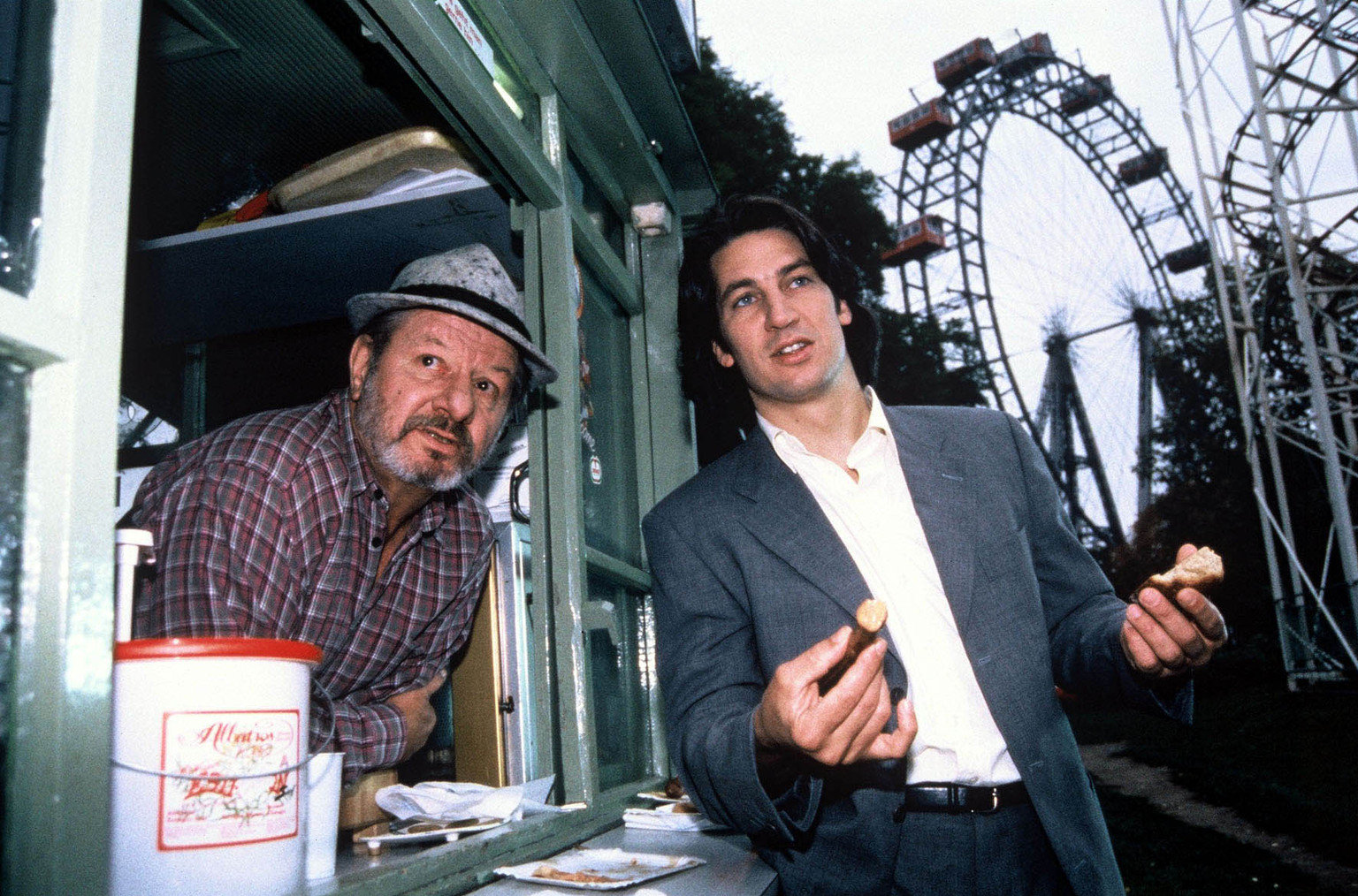 Die Tote von SchönbrunnWie so oft, wenn Kommissar Moser (Tobias Moretti, r.) bei seinen Recherchen in eine Sackgasse geraten ist, genehmigt er sich erst einmal einen Snack an seinem Lieblings-Würstelstand im Prater. Der Würstelmann (Heinz Petters, l.) gibt ihm manchmal wertvolle Tipps und auch Rex ist diesem Abstecher nie abgeneigt ...Bild: © Sat.1 Eigenproduktionsbild frei
