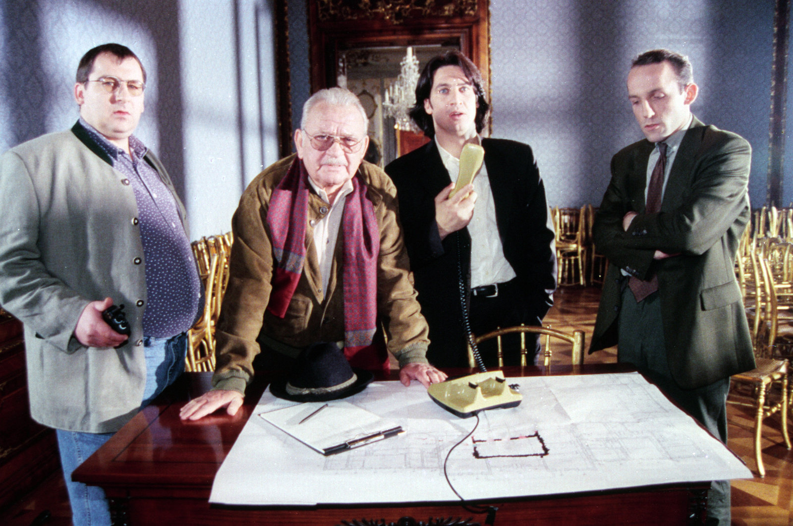 Tanz auf dem VulkanRichie Moser telefoniert über ein Haustelefon mit dem Geiselnehmer Borek. Der pensionierte Polizist Max Koch, Kriminalassisten Ernst Stockinger und Peter Höllerer versuchen ihm zu helfen (v.li.: Wolf Bachofner, Fritz Muliar, Tobias Moretti, Karl Markovics).Bild: © ORF2