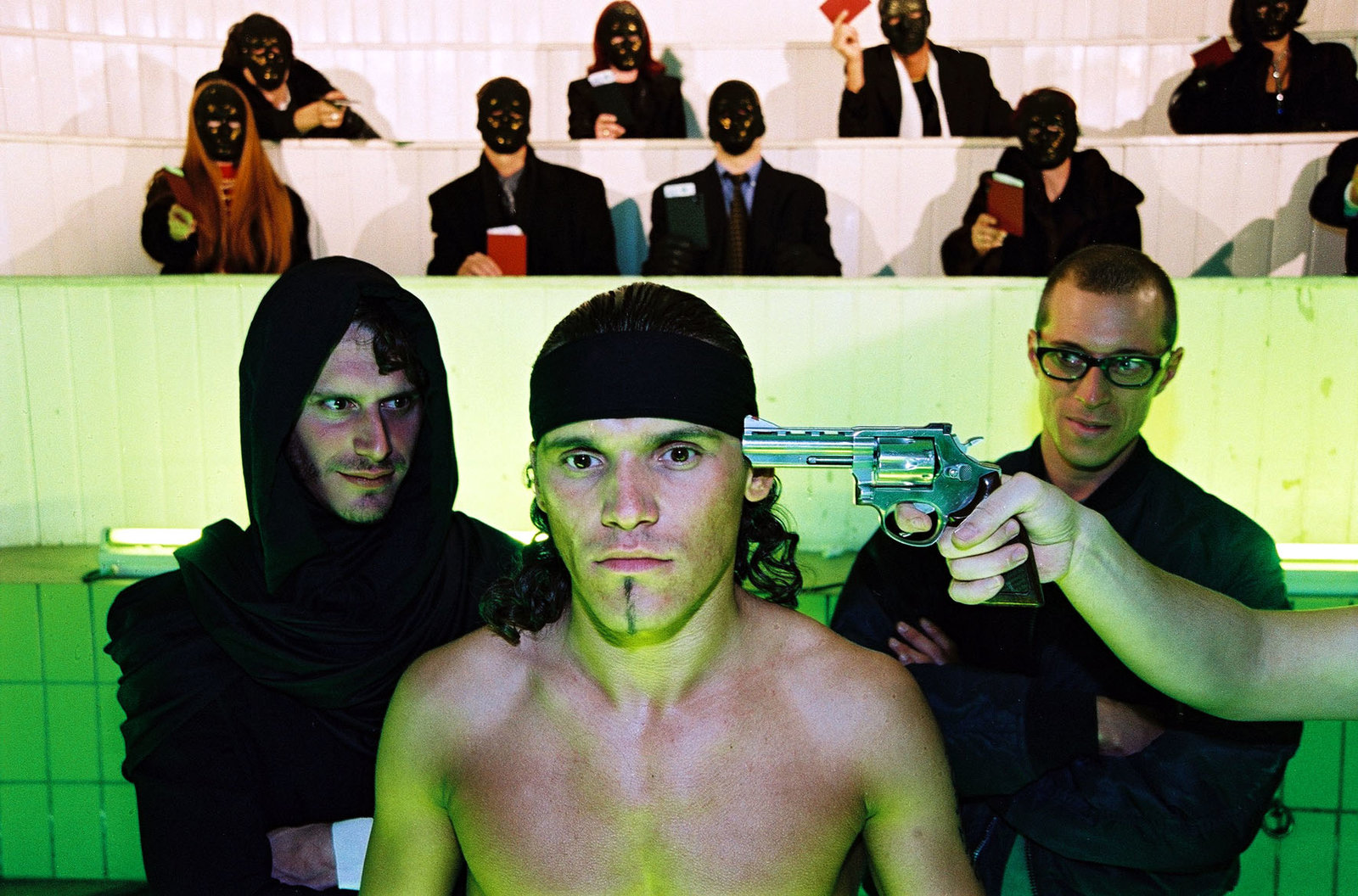 Einer stirbt immerGegen ein hohes Eintrittsgeld können ausgewählte Zuschauer an versteckten Orten schreckliche Schauspiel erleben: Den Kampf von Menschen auf Leben und Tod! Auf den Überlebenden werden Wetten abgeschlossen. (V.l.n.r.: Max Mayer, Haris Bilajbegovic, Michael Pink)Bild: © Sat.1 Gold