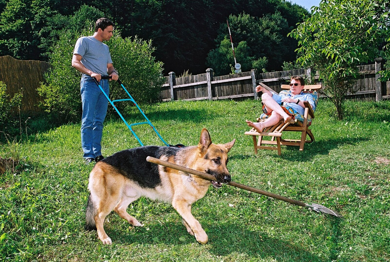 BesessenChristian Böck (Heinz Weixelbraun, r.) entspannt sich in Alexanders Garten, während Brandtner (Gedeon Burkhard, l.) und Rex schwer schuften...Bild: © SAT.1 / Ali Schafler Eigenproduktionsbild frei