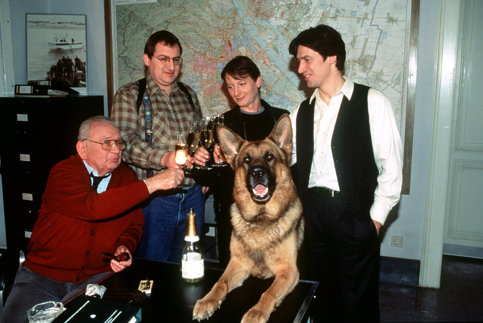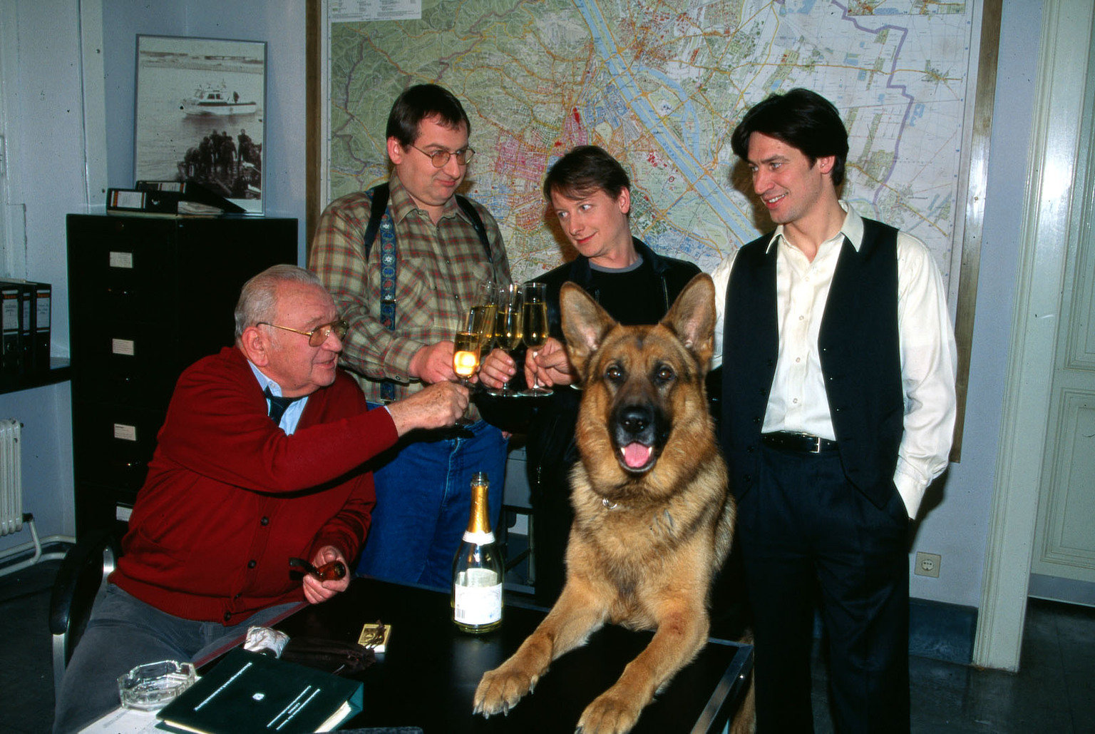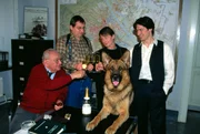 TodesrennenKommissar Moser (Tobias Moretti, r.), Peter Höllerer (Wolf Bachofner, 2.v.l.), Rex und Max Koch (Fritz Muliar, l.) heißen ihren neuen Kollegen Christian Böck (Heinz Weixelbraun, 2.v.r.) willkommen.Bild: © SAT.1 Eigenproduktionsbild frei
