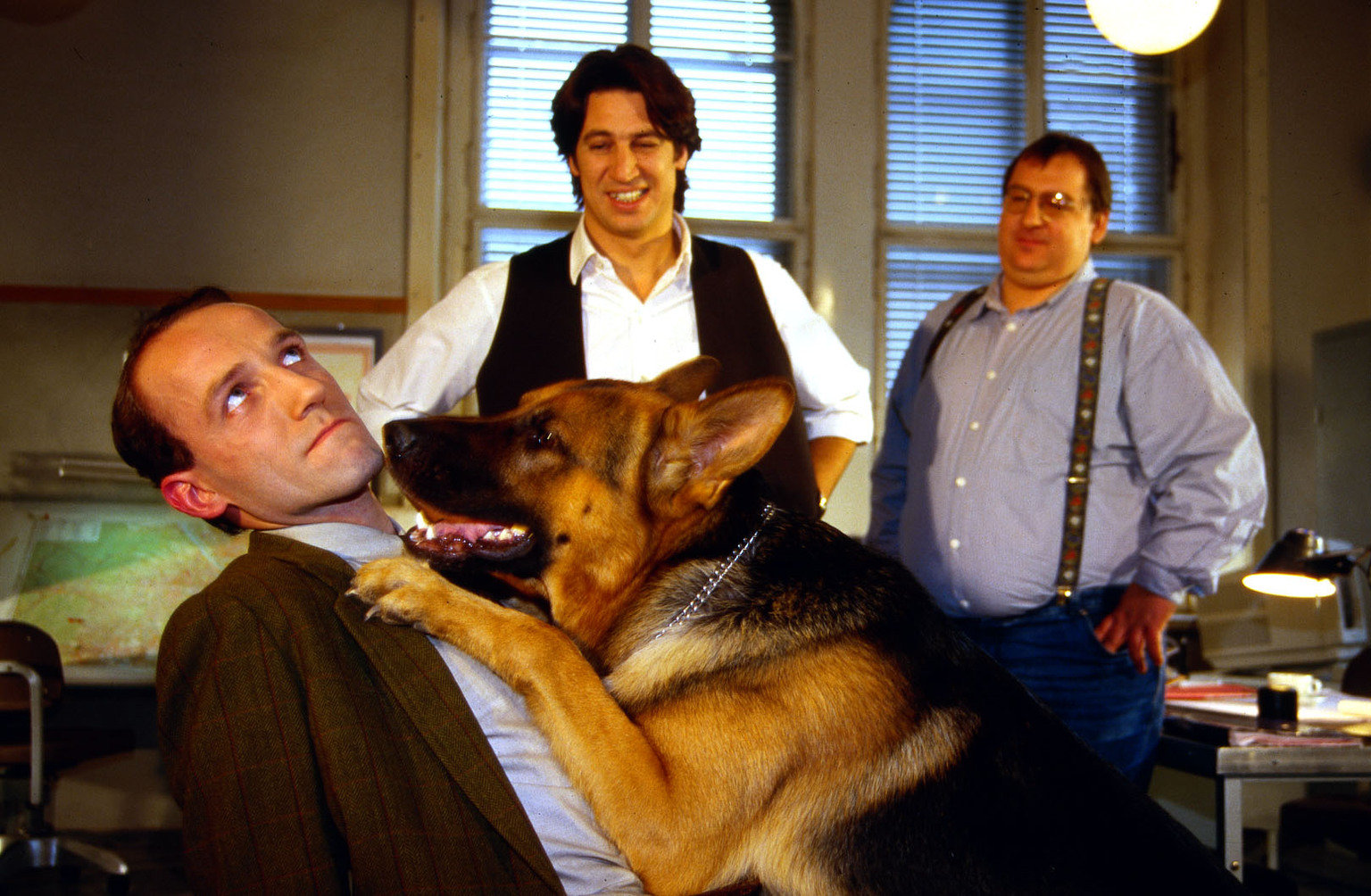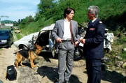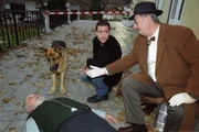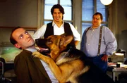 BlutspurenRex kann es nicht lassen. Er geht auf Tuchfühlung mit Ernst Stockinger (Karl Markovics, l.). Moser (Tobias Moretti, M.) und Höllerer (Wolf Bachofner, r.) amüsieren sich prächtig.Bild: © Sat.1 Eigenproduktionsbild frei