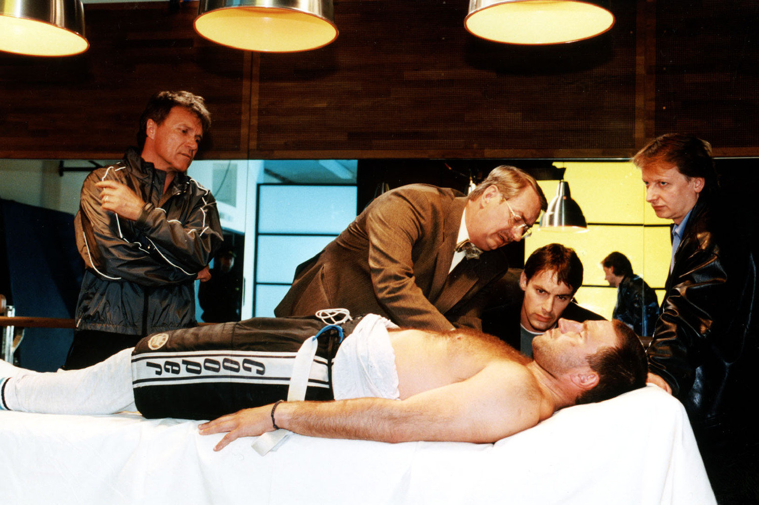 EiskaltGerichtsmediziner Dr. Leo Graf (Gerhard Zemann, 2.v.l.) bei der ersten Untersuchung der Leiche des Eishockey-Spielers Pokorny. Kommissar Brandtner (Gedeon Burkhard, 2.v.r.) entdeckt in der Schulter des Toten eine winzige Hohlnadel. Rechts: Kommissar Böck (Heinz Weixelbraun) und der Trainer (Wolfram Berger, l.).Bild: © SAT.1 Eigenproduktionsbild frei