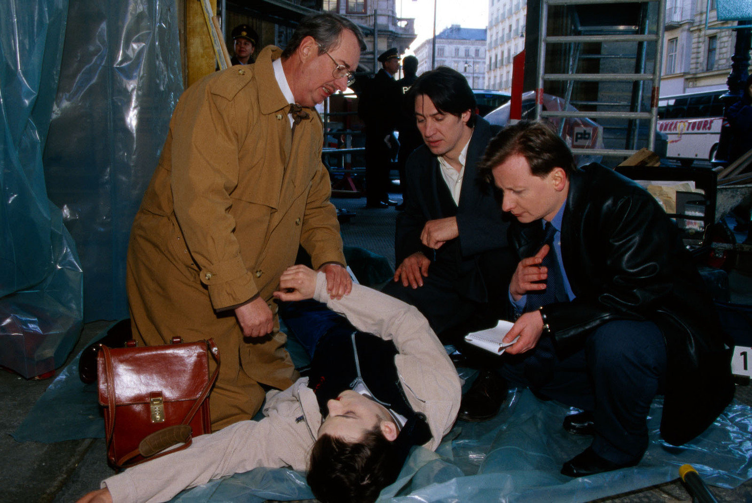 Tod eines SchülersDr. Leo Graf (Gerhard Zemann, l.), Kommissar Moser (Tobias Moretti, M.) und Böck (Heinz Weixelbraun, r.) untersuchen die Leiche von Stefan Dorner (Torben Liebrecht, vorne).Bild: © Sat.1 Eigenproduktionsbild frei