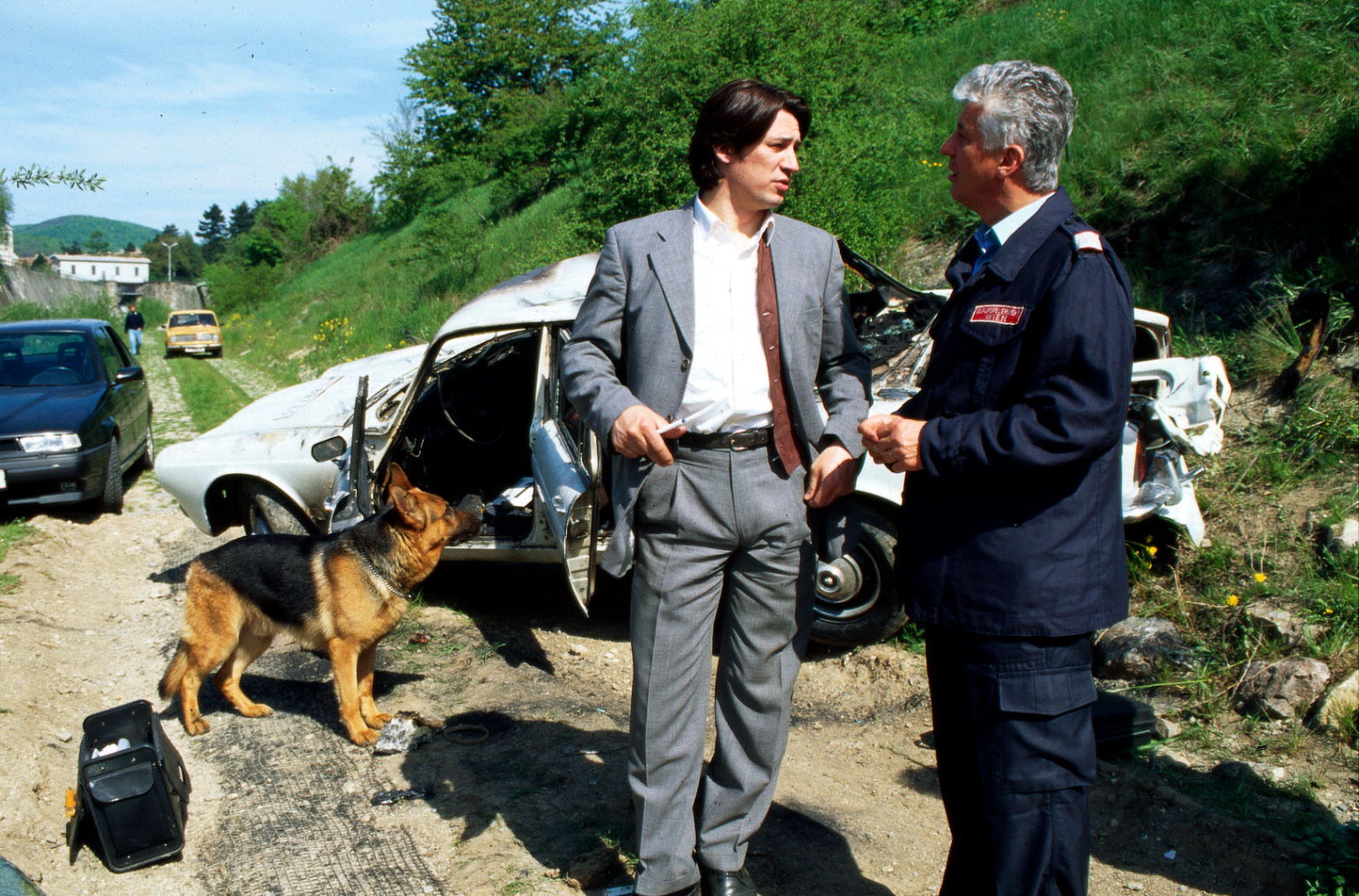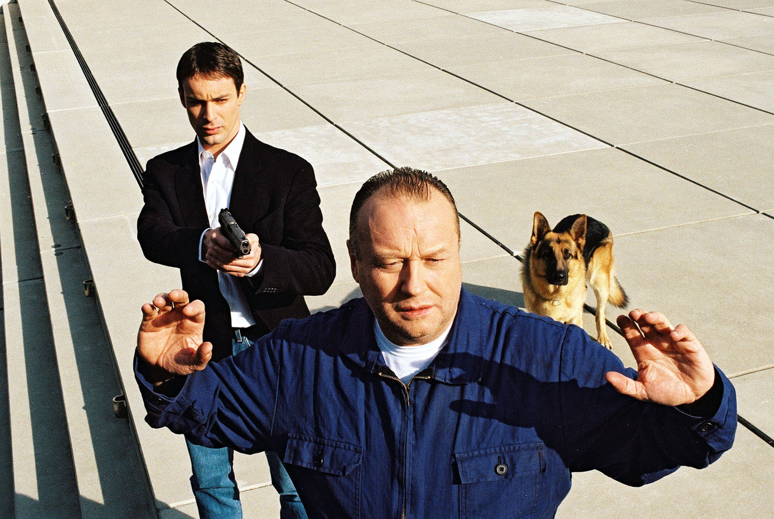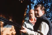 GiftgasKommissar Brandtner (Gedeon Burkhard, l.) und Rex haben den Verdächtigen Gerhard Frank (Thomas Thieme, r.) gestellt. Was hat er mit dem Giftgas-Attentat zu tun?Bild: © Sat.1 Eigenproduktionsbild frei