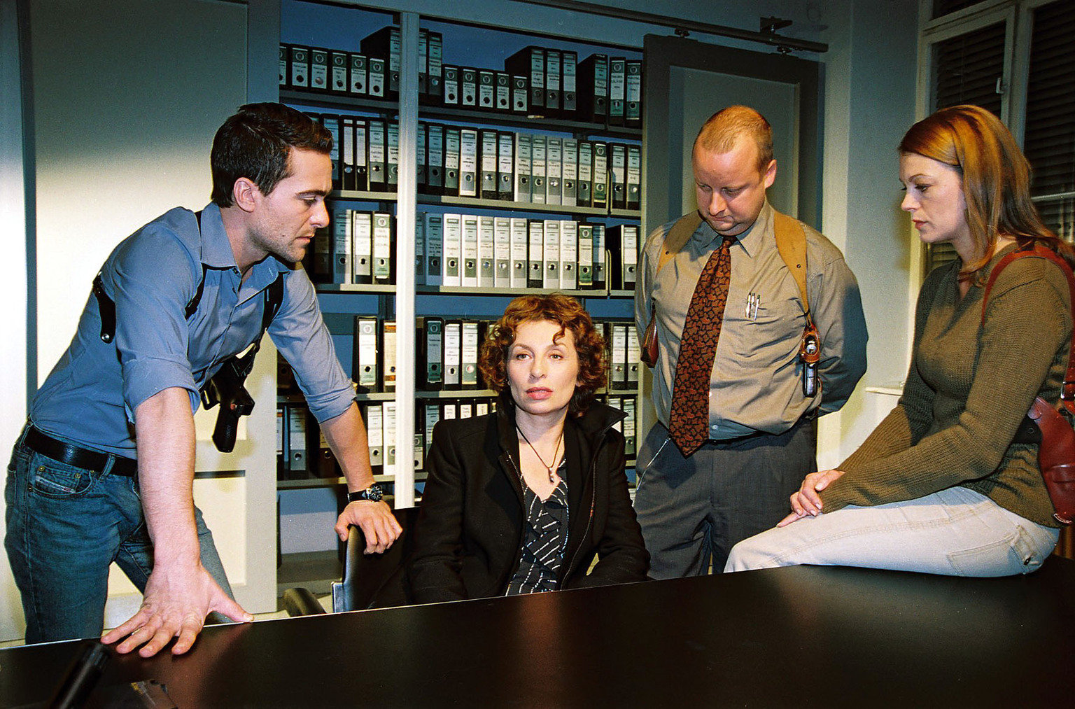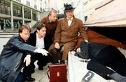 Ein Toter kehrt zurückHelmut Walz (William P. Mang, r.), ein ehemaliger Kollege von Fritz Kunz (Martin Weinek, M.), wird tot aufgefunden. Böck (Heinz Weixelbraun, l.), Brandtner (Gedeon Burkhard, 2.v.l.) und Gerichtsmediziner Graf (Gerhard Zemann, 2.v.r.) untersuchen Leiche und Fundort.Bild: © Sat.1 Eigenproduktionsbild frei