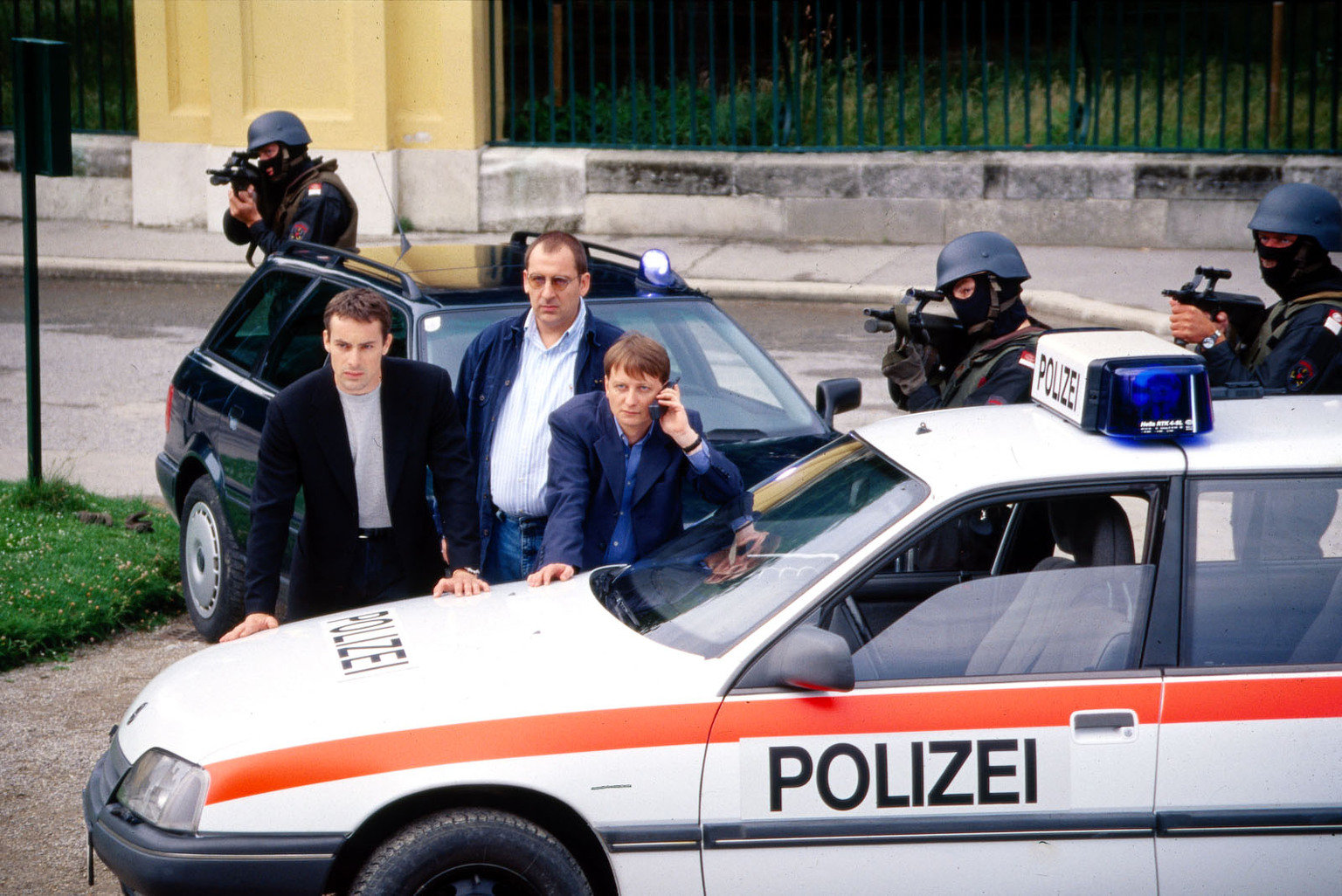 Der Mann mit den 1000 GesichternKommissar Brandtner (Gedeon Burkhard, l.), Höllerer (Wolf Bachofner, M.) und Böck (Heinz Weixelbraun, r.) versuchen mit Hilfe eines Einsatzkommandos, den Geiselnehmer zu stellen.Bild: © Sat.1 Eigenproduktionsbild frei