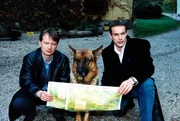 Geraubtes GlückBöck (Heinz Weixelbraun, l.), Rex und Kommissar Brandtner (Gedeon Burkhard, r.) versuchen, sich auf einer Landkarte zu orientieren.Bild: © Sat.1 Eigenproduktionsbild frei