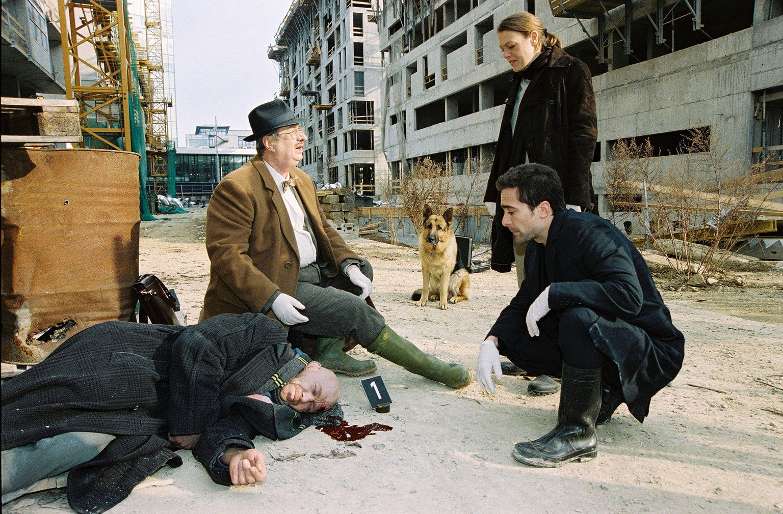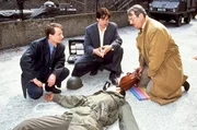 Die blinde ZeuginGerichtsmediziner Dr. Leo Graf (Gerhard Zemann, li.), Ernst Stockinger (Karl Markovics, mi.) und Richie Moser (Tobias Moretti, re.) untersuchen den ermordeten Klaus Schuhmann (Gerhard Acktun).Bild: © ORF2