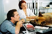 Ein Toter und ein BabyRex spendet unter den wachsamen Augen der Tierärztin (Katrin Reisinger, r.) und Marc (Alexander Pschill, l.) Blut.Bild: © Sat.1 Eigenproduktionsbild frei