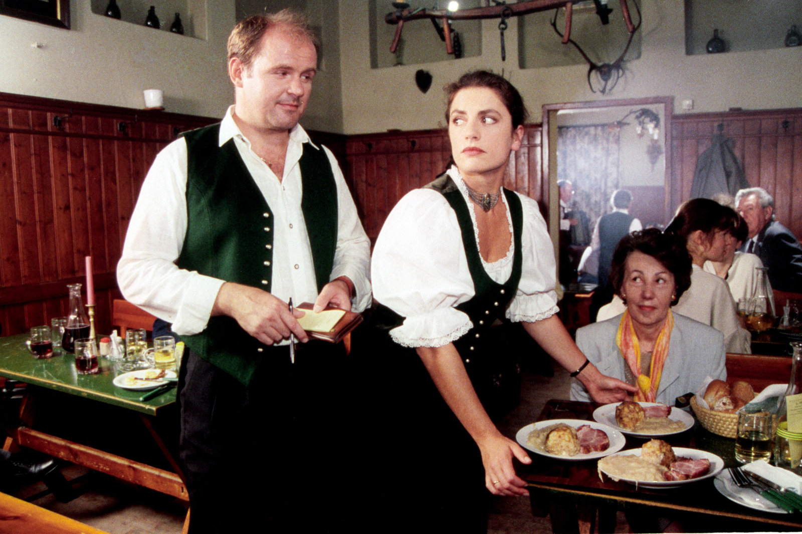 Ein perfekter MordDie Heurigenwirtin Helga Felsner (Christine Neubauer) ihr Kellner (August Schmölzer) kommen mit dem Servieren kaum nach, während ihr Mann Hans und Schwägerin Gerda im Weinkeller sind.Bild: © ORF