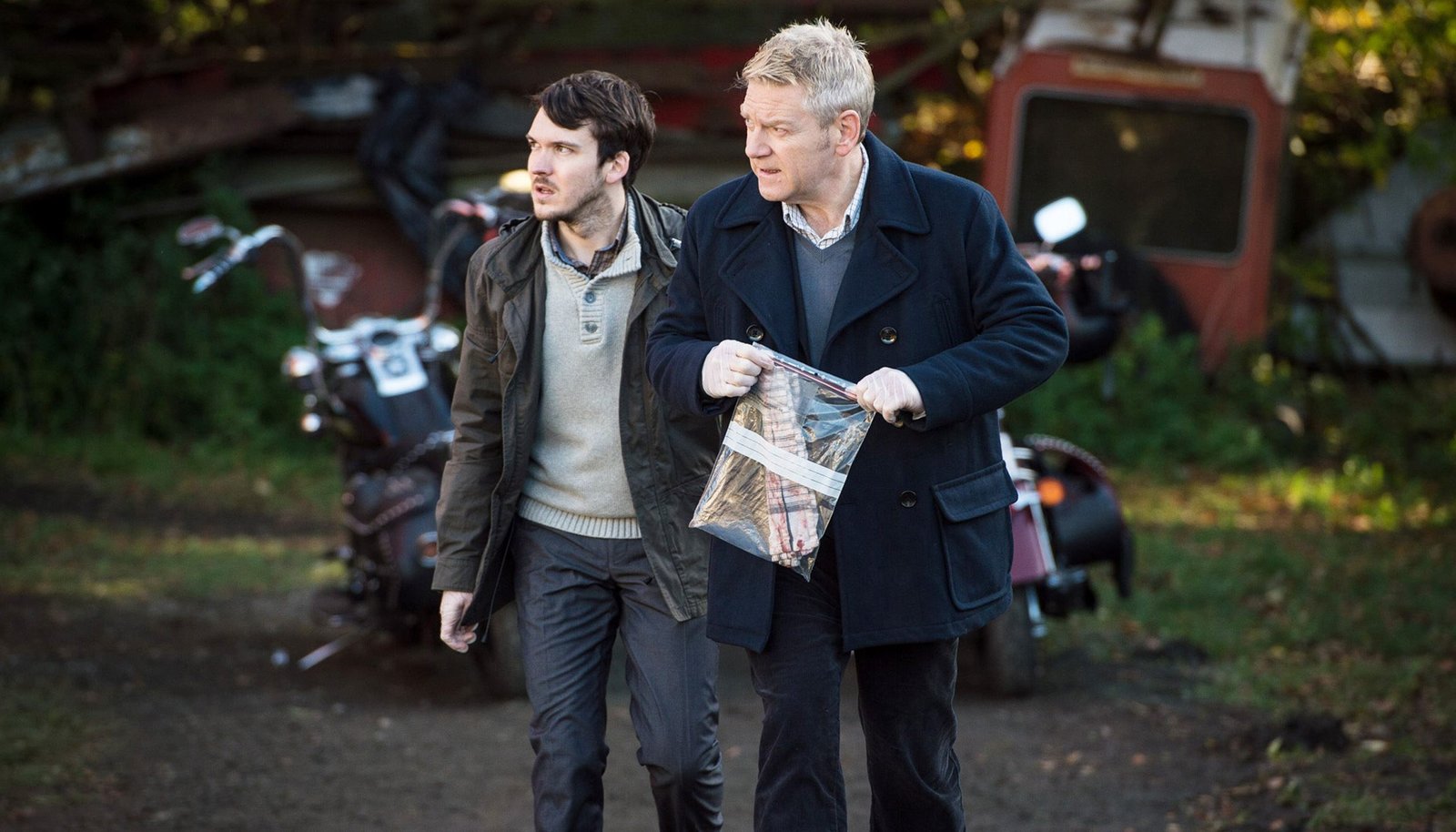 Lektionen der LiebeWallander (Kenneth Branagh) und sein junger Kollege Tobias Eliasson (Joe Claflin) mit der sichergestellten Tatwaffe.Bild: © ARD Degeto/Yellow Bird/Left Bank Pictures/Steffan Hill