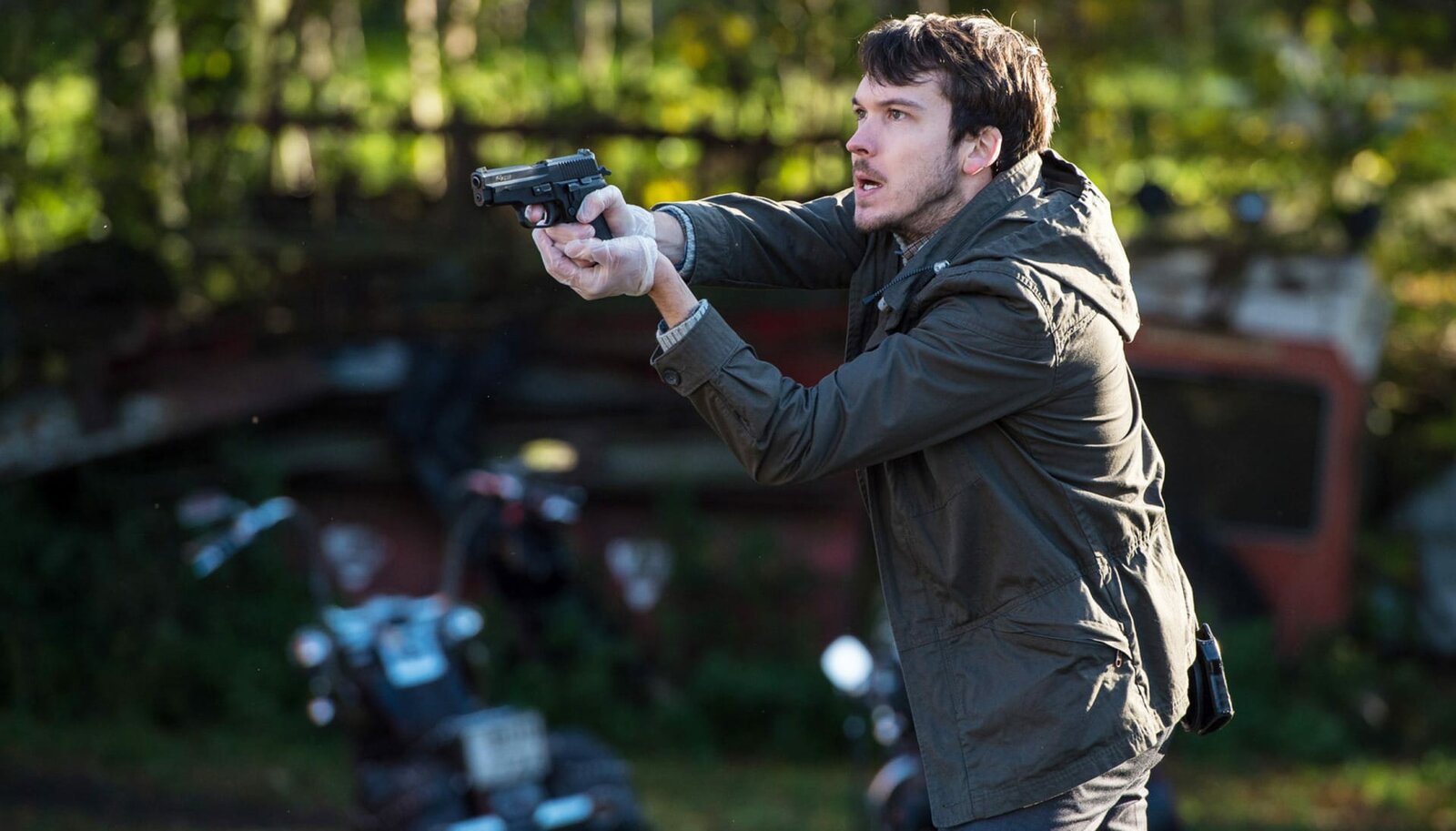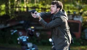 Lektionen der LiebeWallander junger Kollege Tobias Eliasson (Joe Claflin) bemerkt die Gefahr und zieht die Waffe.Bild: © ARD Degeto/Yellow Bird/Left Bank Pictures/Steffan Hill