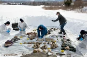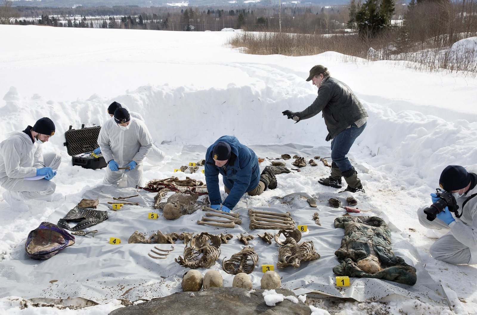 Eisige Schatten (2)Kommissar William Wisting (Sven Nordin, Mitte), FBI-Special-Agent Maggie Griffin (Carrie-Anne Moss, Mitte) und seine Kollegin Torunn (Kjersti Sandal) machen einen schrecklichen Fund.Bild: © HR/Degeto/Wisting Production A/S