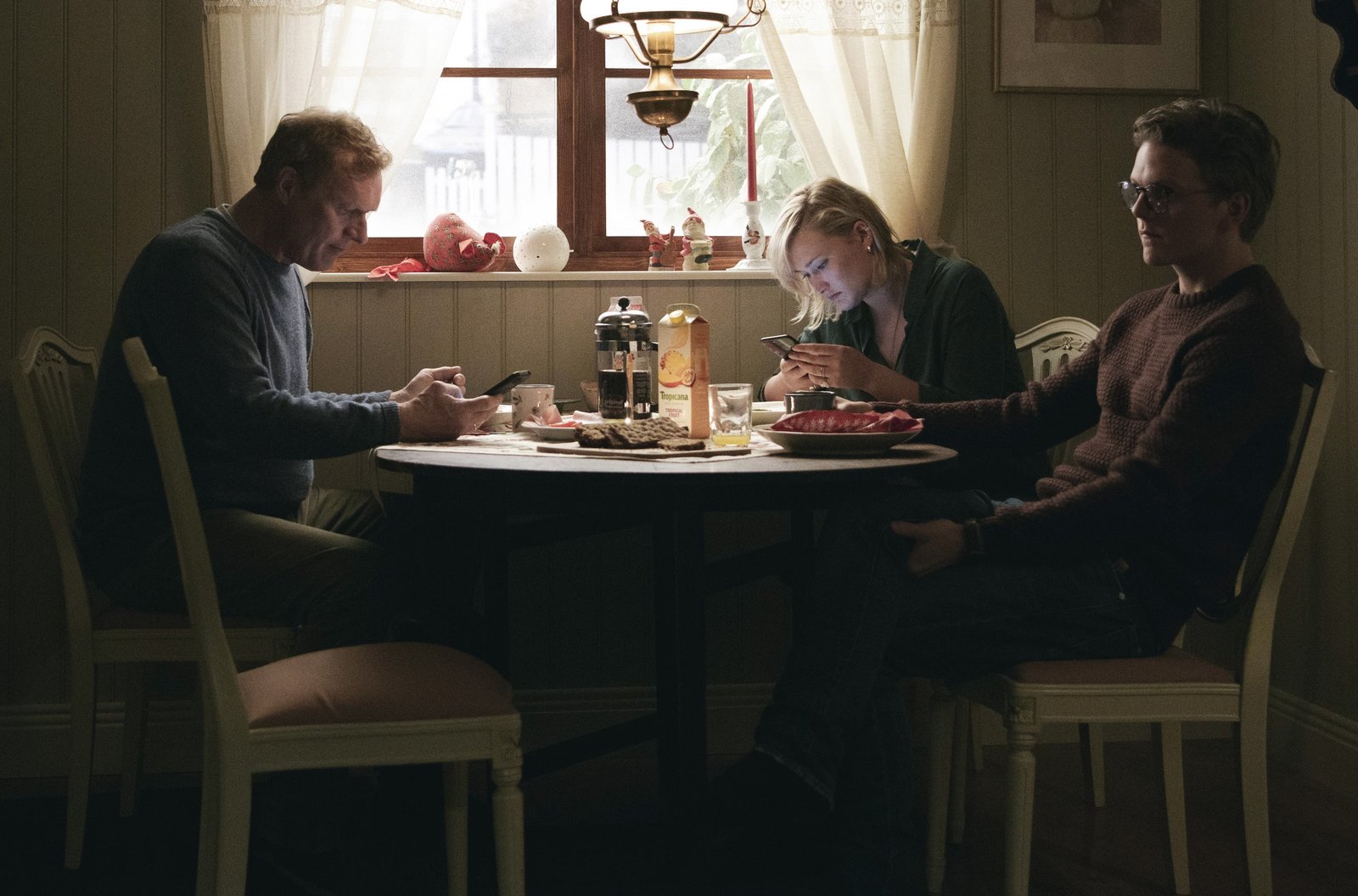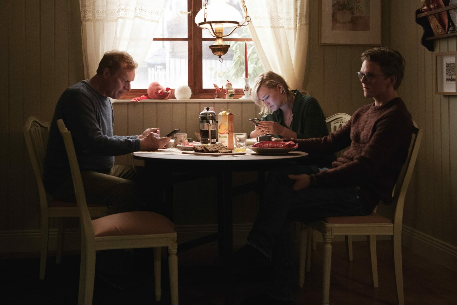 Eisige Schatten (2)Familienbesuch: Wisting (Sven Nordin, li.) mit Sohn Thomas (Jonas Strand Gravli) und Tochter Line (Thea Green Lundberg).Bild: © ARD Degeto/Wisting Production A/S/Trygve Indrelid