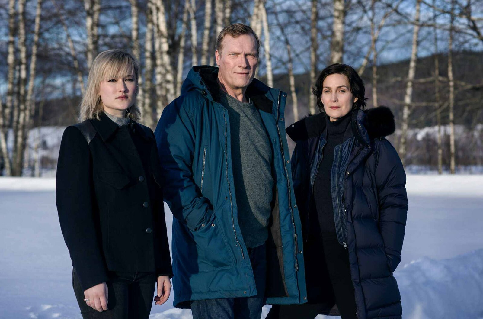 Eisige Schatten (1)Kommissar William Wisting (Sven Nordin) mit der FBI-Agentin Maggie Griffin (Carrie-Anne Moss) und seiner Tochter Line (Thea Green Lundberg, li.).Bild: © ARD Degeto/Wisting Production A/S/Julia Nagelstad